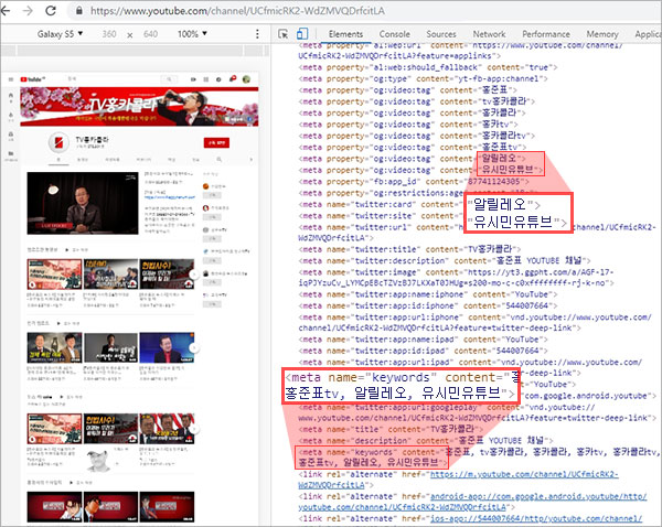 'TV홍카콜라' 채널은 왜 경쟁 채널의 키워드를 메타 정보에 기재해 놓았을까? 바로 유튜브에서 '알릴레오' 또는 '유시민 유튜브'로 검색했을 때 'TV홍카콜라'가 노출되게 하기 위한 SEO 작업을 한 것으로 보인다. 물론 이렇게 한다고해서 노출되기가 쉽지는 않겠지만 가능성은 있기 때문이다.