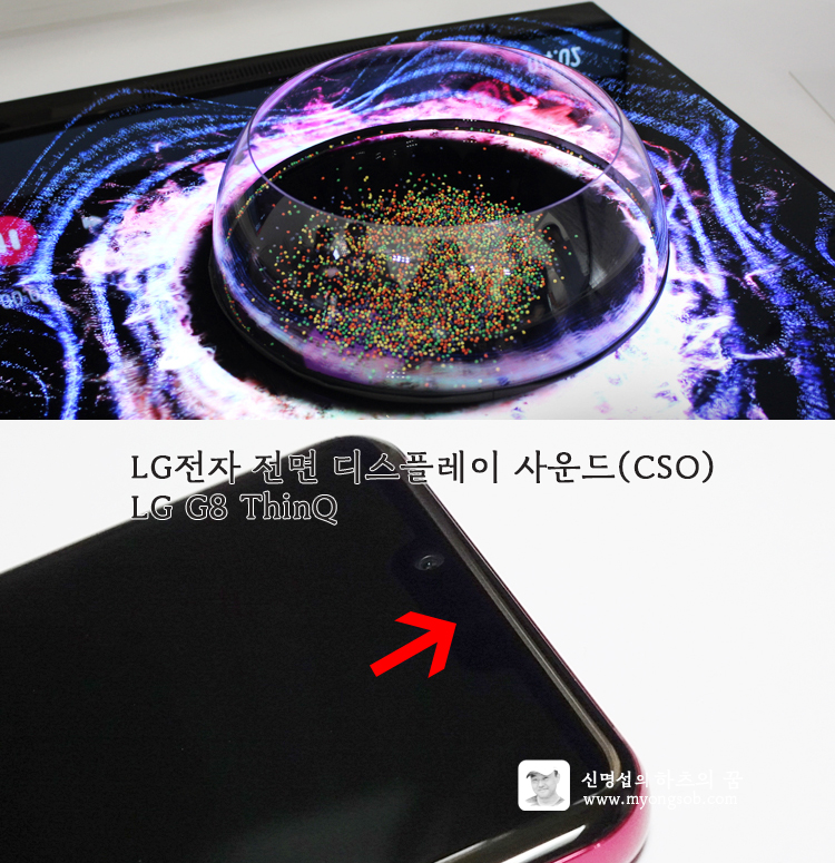 전면 전체를 유리로 만들기 위해서는 전면 리시버 홀(스피커)도 없애야 한다. LG전자는 LG G8 ThinQ 스마트폰에 전면 디스플레이를 적용하면서 디스플레이에서 소리가 나는 Crystal Sound OLED(CSO) 기술을 적용했다. (사진 출처 LG디스플레이 블로그, 라지온 블로그)