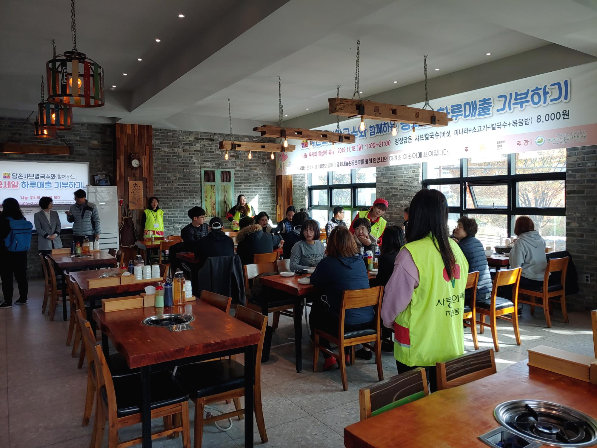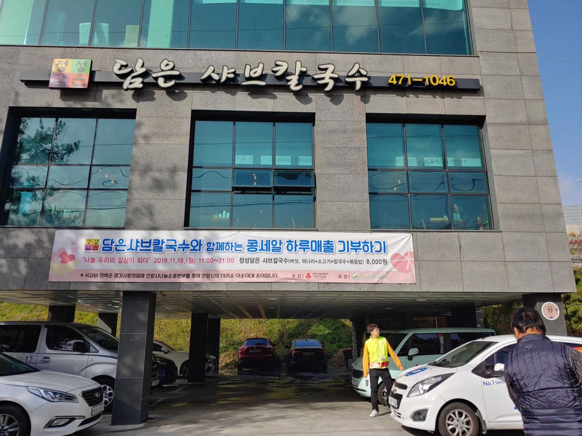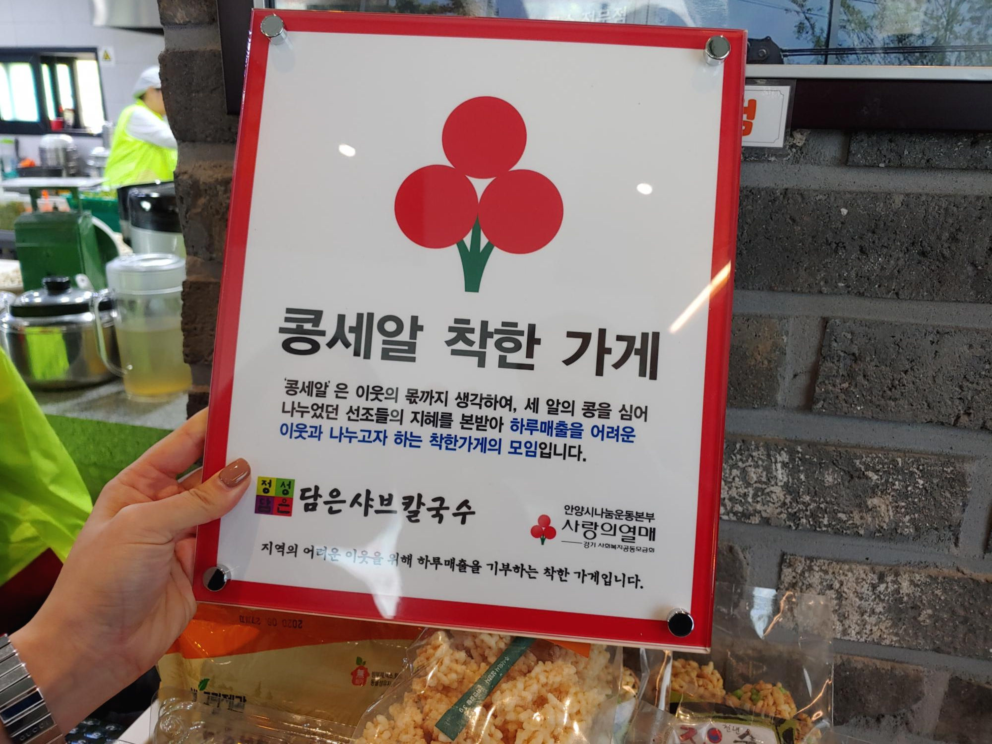 안양시나눔운동본부의 '콩세알' 나눔 운동에 안양예술공원 맛집으로 유명한 '정상담은샤브칼국수' 가게가 참여해서 하루 매출을 기부하는 행사를 가졌다.