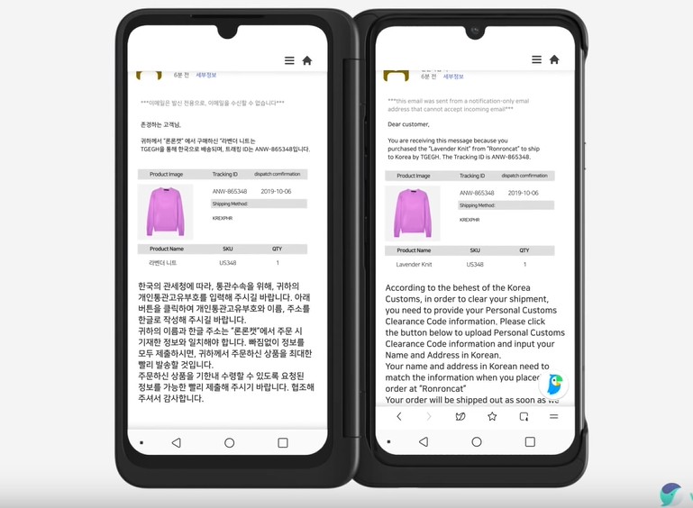 LG V50S ThinQ 스마트폰은 상황이 다르다. 듀얼 스크린이 있어서 원본을 보는 화면과 번역된 화면을 동시에 띄워놓고 비교해보면서 볼 수 있기 때문이다. 또한 파파고 등 번역 앱을 별도 스크린에 띄워 놓고 필요한 문장 만 선택해서 번역해 보면서 이용할 수도 있다.