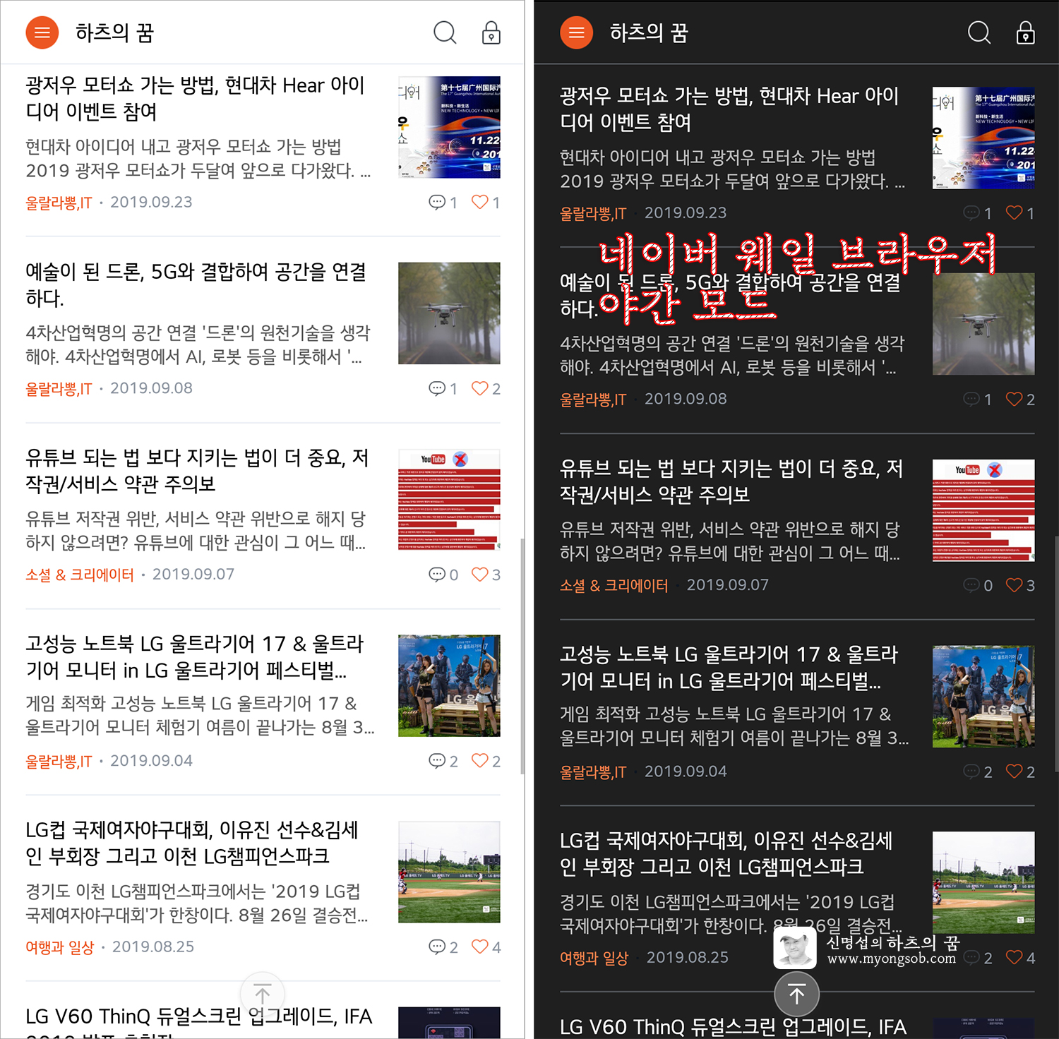 위 사진에서 보듯이 화면을 검게 만든다고해서 가독성이 떨어지는 것은 아니다. 단지 반전 정도의 느낌으로 화면을 보여주는 것이어서 야간에 보거나 주간에 봐도 화면을 읽는데 문제가 없다.