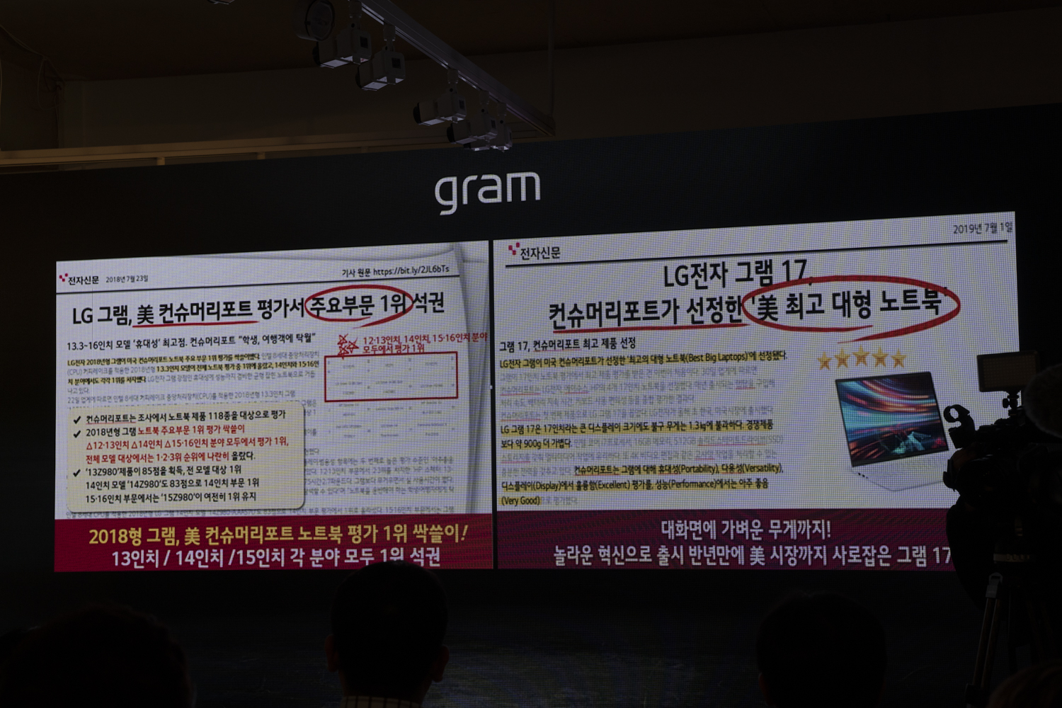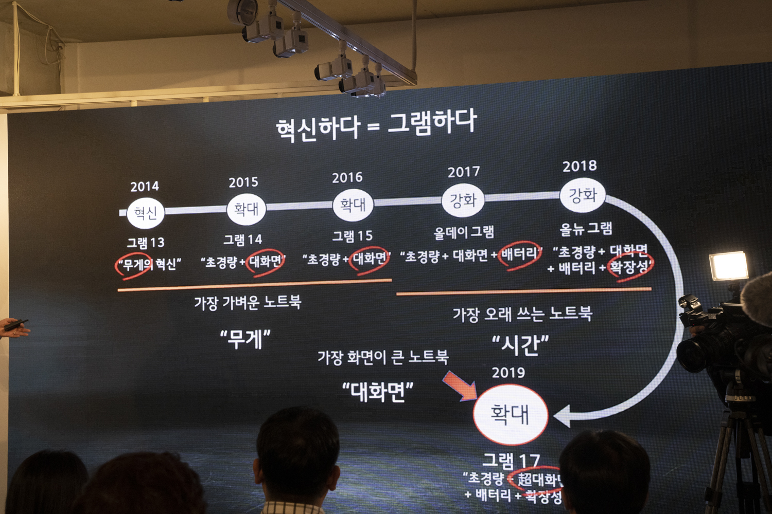 2014년 처음 등장한 그램은 1Kg이 채 되지 않은 무게를 어필하며 2018년 5월 판매량 100만대를 돌파했고, 기세를 몰아 대부분 제조사가 접근하지 않던 17인치 크기의 노트북 '그램 17'을 선보이며 또 한번을 돌풍을 일으켰다.