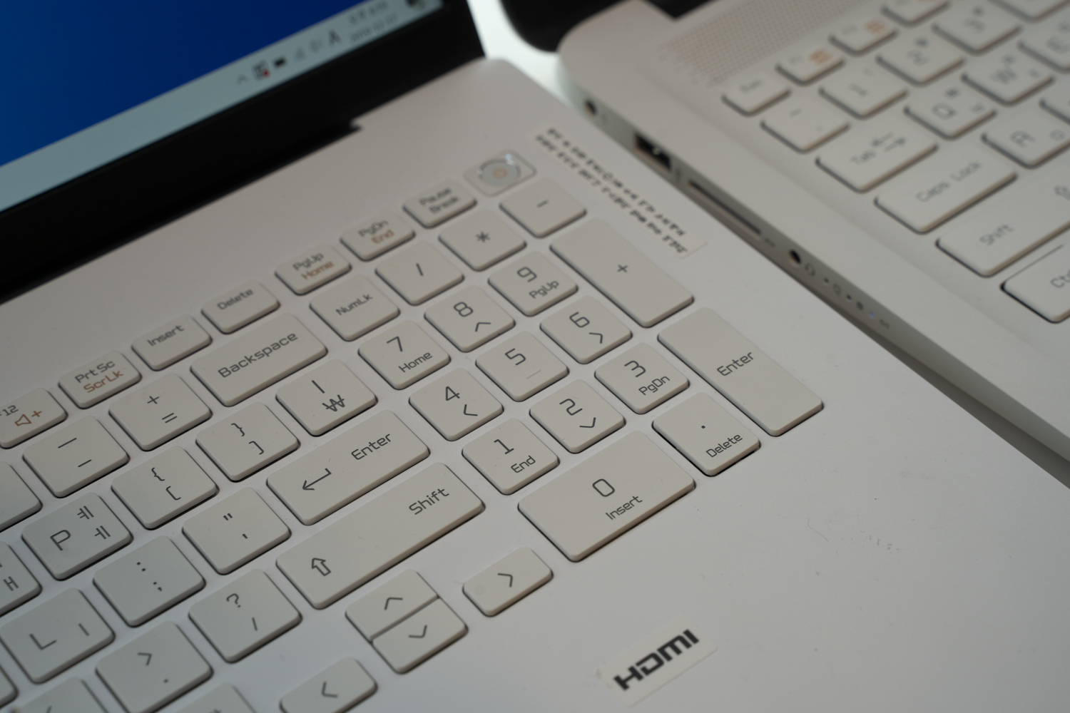 이번 2020년형 LG 그램 17에는 표준으로 인식되어 있는 4열 숫자 키보드를 탑재했다. 일반 키보드와 거의 유사한 사용감으로 키보드를 사용할 수 있어서 작업 효율이 상당히 증가할 것으로 보인다. 키보드는 퓨어 화이트 백라이트가 적용되어 있다.