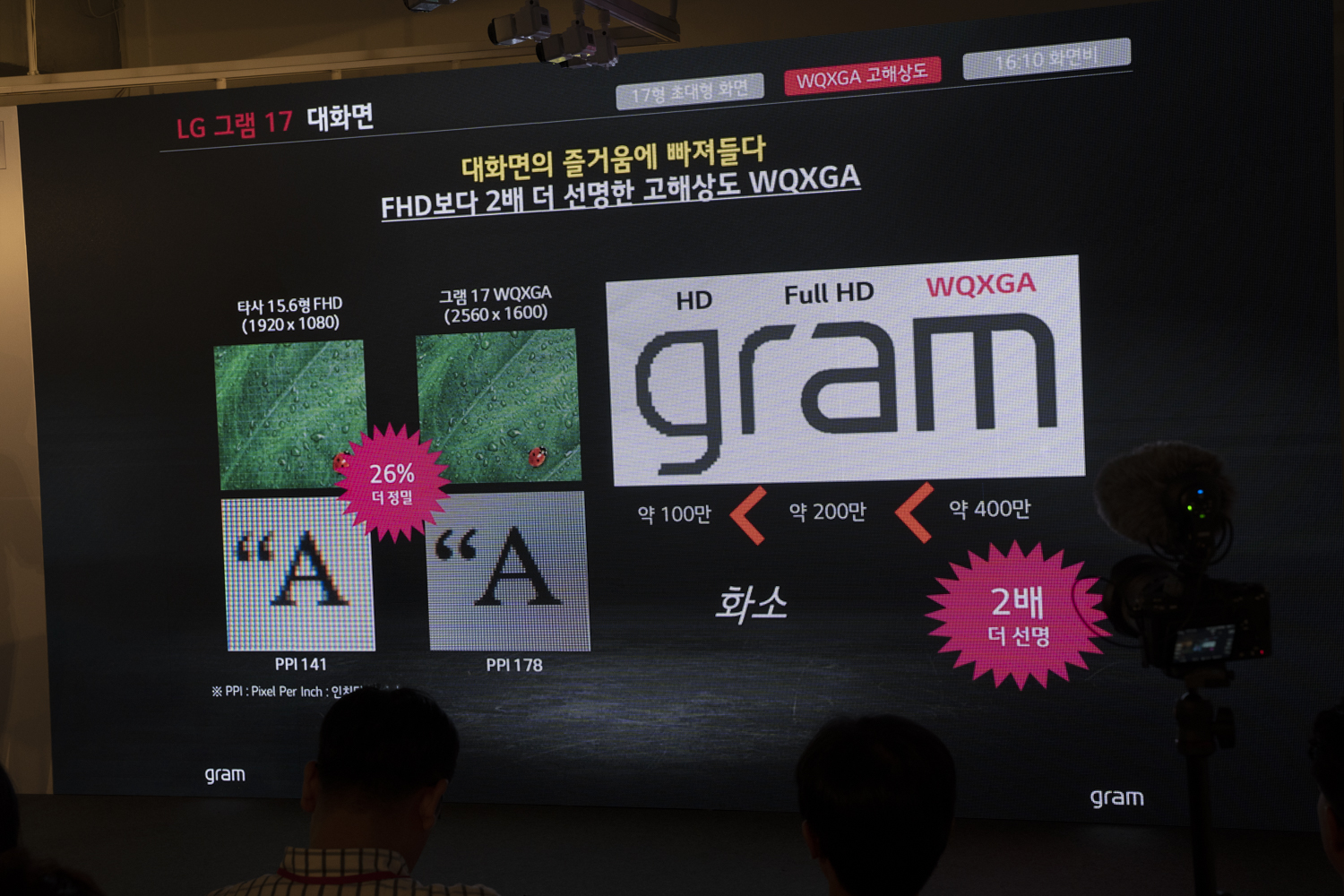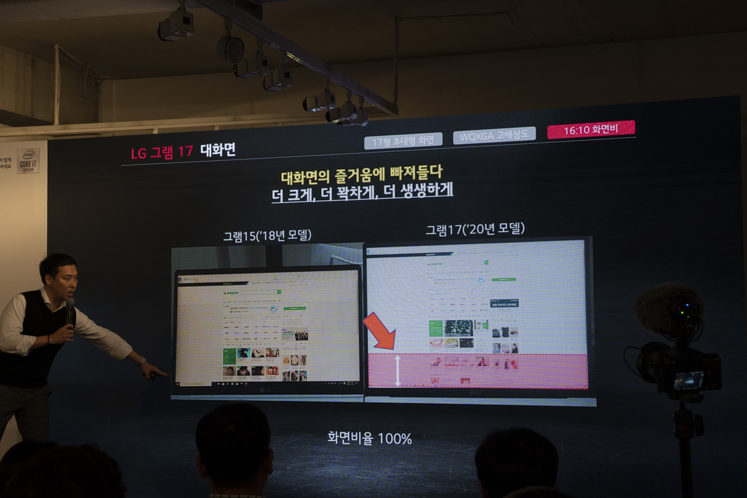 LG 그램 17은 대부분 노트북이 채택하고 있는 16:9 가 아닌 16:10의 화면비로 출시가 되었다. 그만큼 세로로 화면 공간을 더 가질 수 있다는 것이다. 이날 발표하는 분이 직접 촬영하였다며 보여준 사진에서도 그 차이를 확인할 수 있었다.