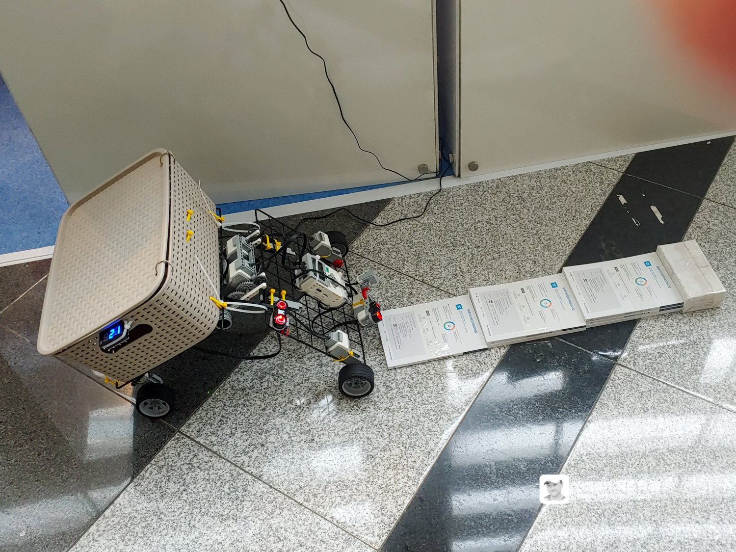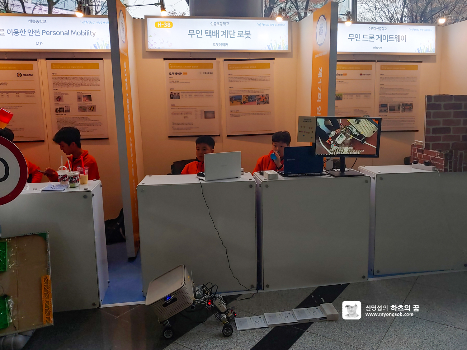 이번 전시회에는 무인 기기에 대한 전시가 많았다. 그 중 패턴 만 인식되면 어렵지 않게 실현이 가능한 것이 택배일 것이다. 신풍초등학교에서는 '무인 택배 계단 로봇'을 선보였다.
