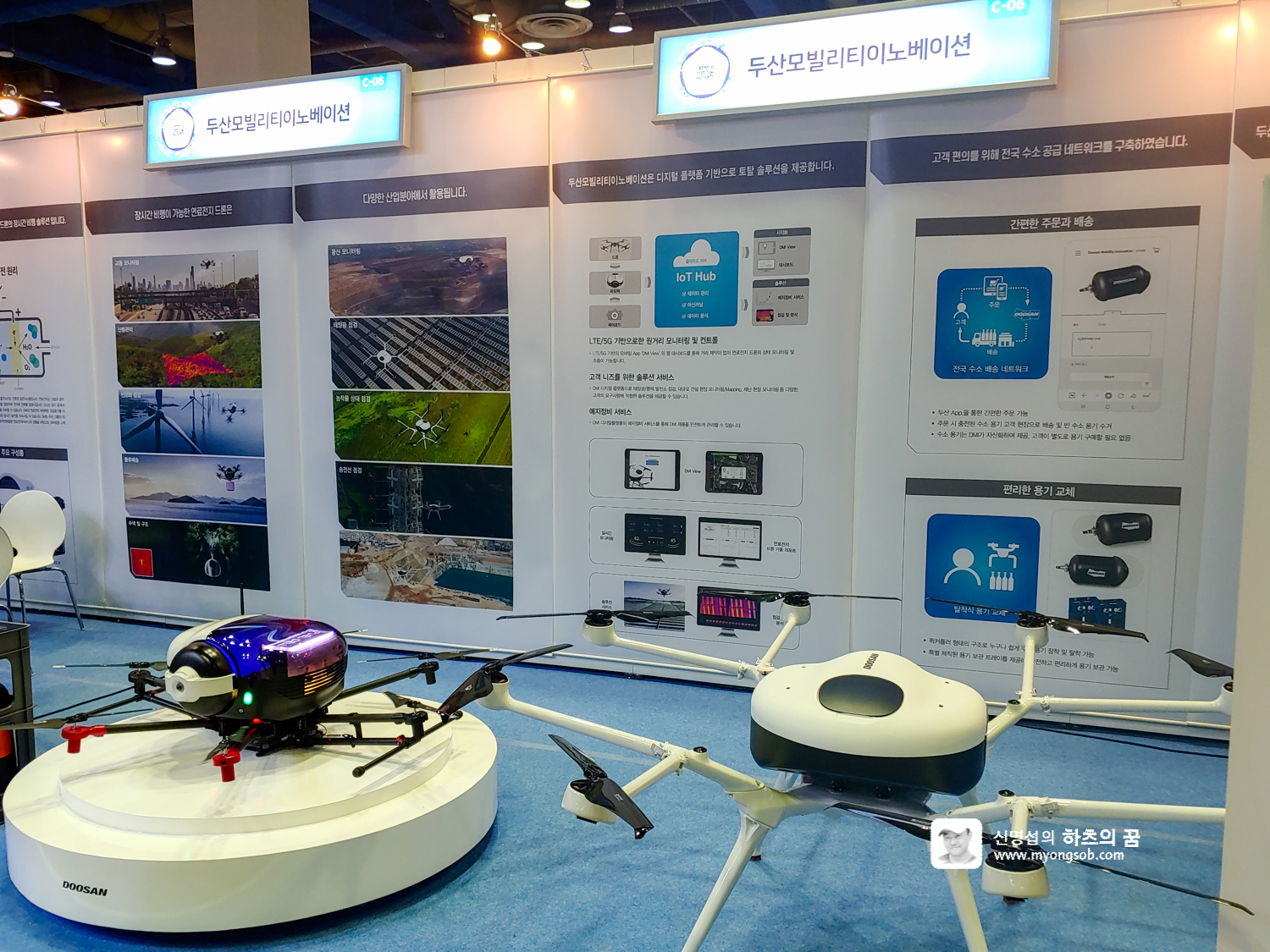 두산모밀리티이노베이션에서는 다양한 드론을 선보였다. 드론의 문제점 중 하나로 지적되고 있는 연료전지에 대한 기술를 고도화하여 장시간 비행이 가능한 드론을 개발하고 있다.