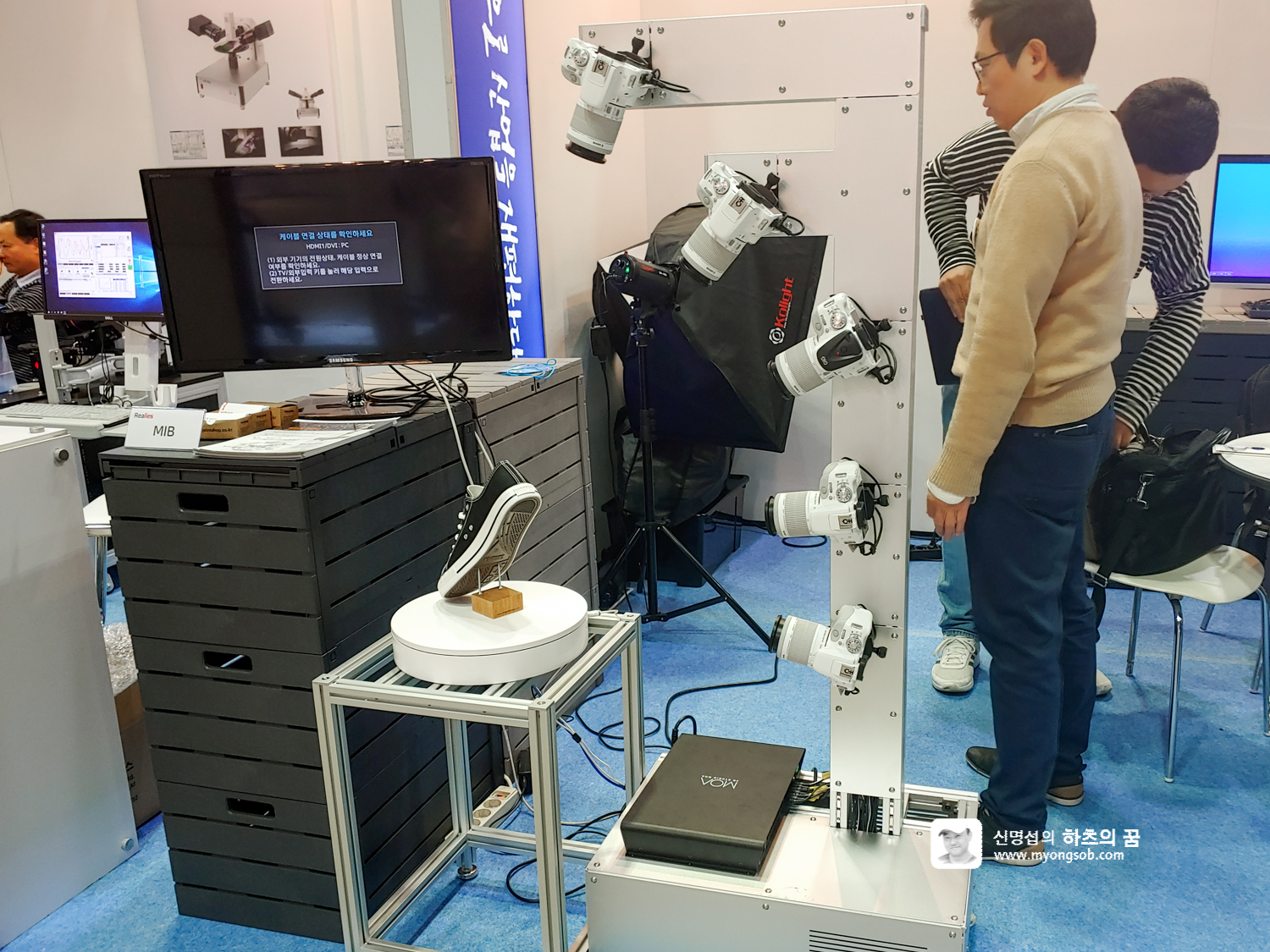 여러개의 카메라를 이용하여 AR 및 VR 용 고품질 텍스쳐 및 모델링 추출에 활용되는 MOA 3D 사의 MID 500 기기다. 여러개의 카메라를 정밀하게 컨토롤하여 제품 사진을 촬영하여 자동으로 합성하여 3D입체 사진을 만들어내는 것이다.