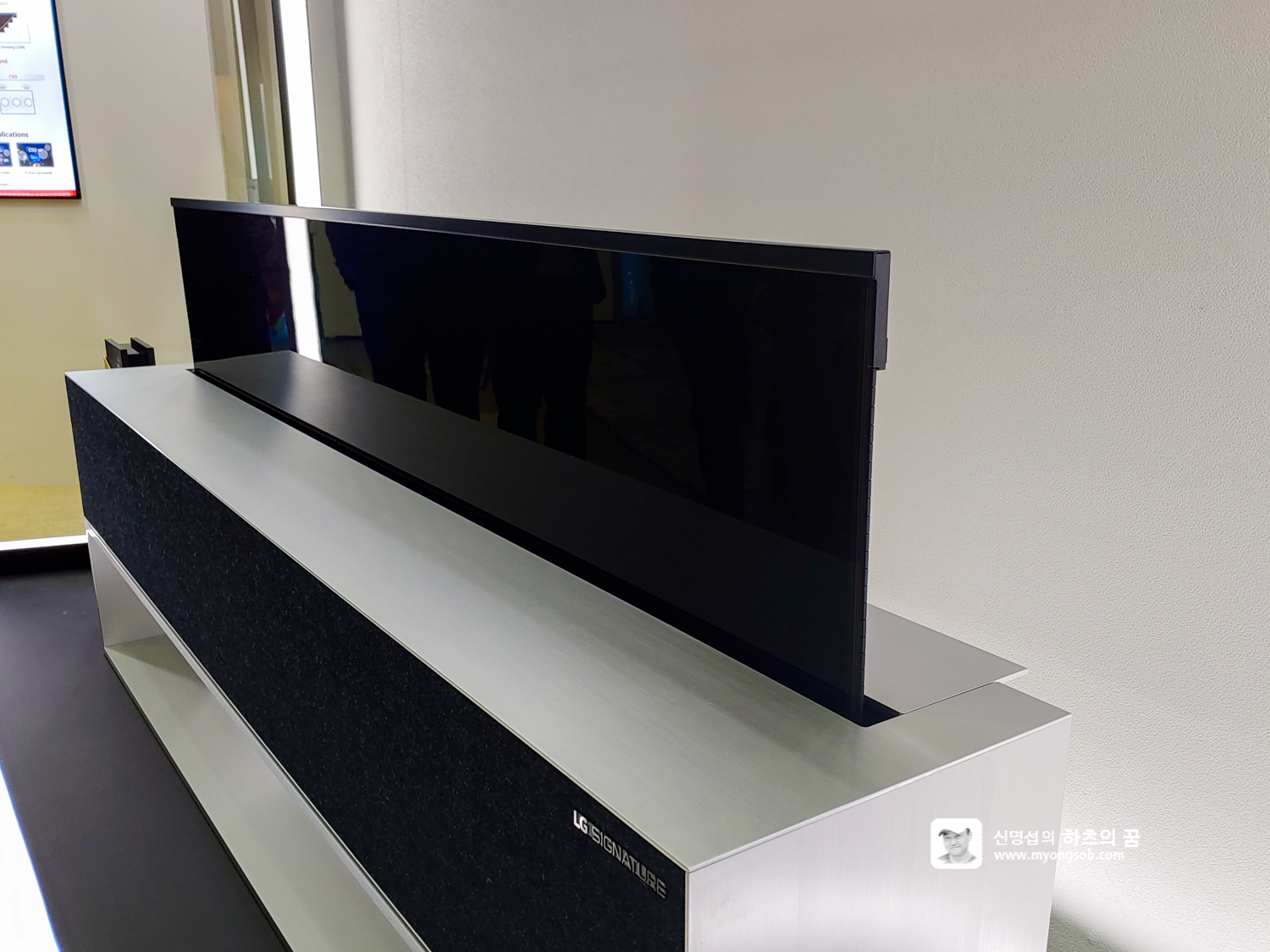 얇은 올레드 TV에서 별도의 스피커 없이 소리가 나는 '8K 크리스탈 사운드 올레드 TV'도 전시되어 있다. 실제 스크린에서 소리가 나는 지 손을 대보는 분들이 많았다.