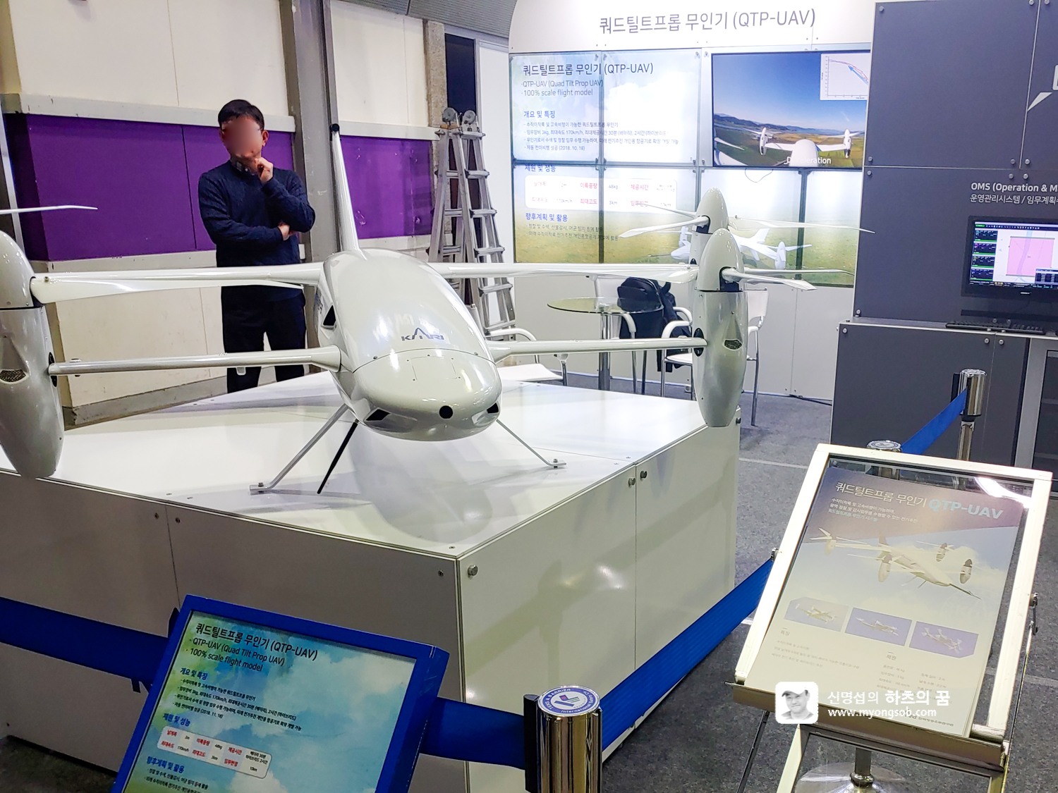 이번에 좀 더 눈길이 가는 것은 '쿼드틸트프롭 무인기(QTP-UAV)'였습니다. 수직이착률이 가능하고 고속비행이 가능한 무인 항공기다. 최대 배터리로 30분, 하이브리드 방식으로 2시간까지 비행을 할 수 있다. 사람이 접근하기 어려운 산불 수색이나 바다 선박 구조 등에 유용할 것이고, 동체가 크지 않아서 바다 위 선박에서도 비행이 가능하다.