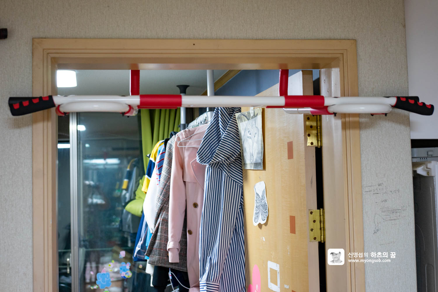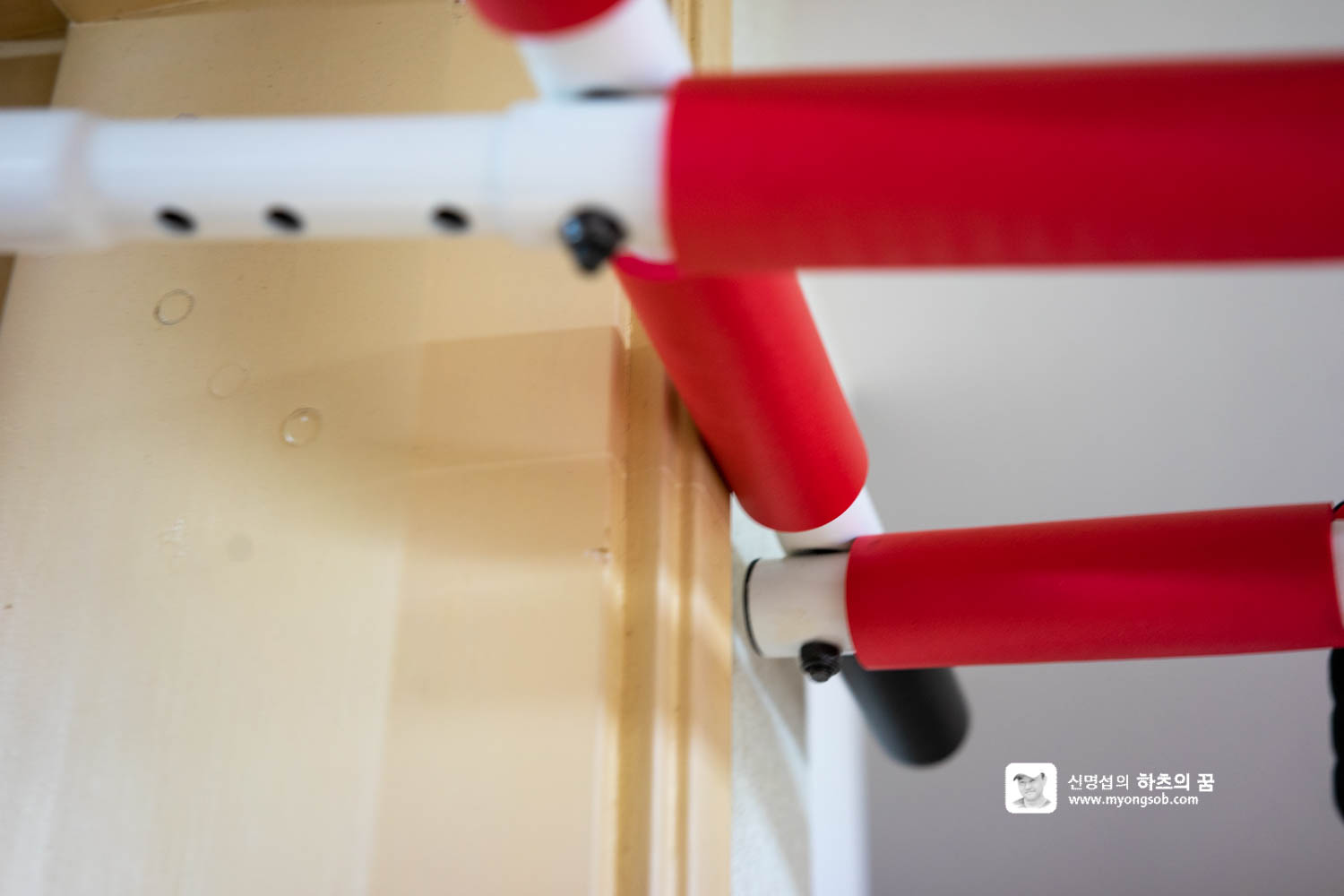 약 20여분 동안 조립해서 철봉을 완성했다. 위 사진에서 보면 벽에 걸려 있는 부분이 잘못 설치되어 있다. 검은색 고무가 벽에 닿게 조립했어야 하는데 반대로 한 것이다. 이렇게 조립해도 거치에 문제는 없다.
