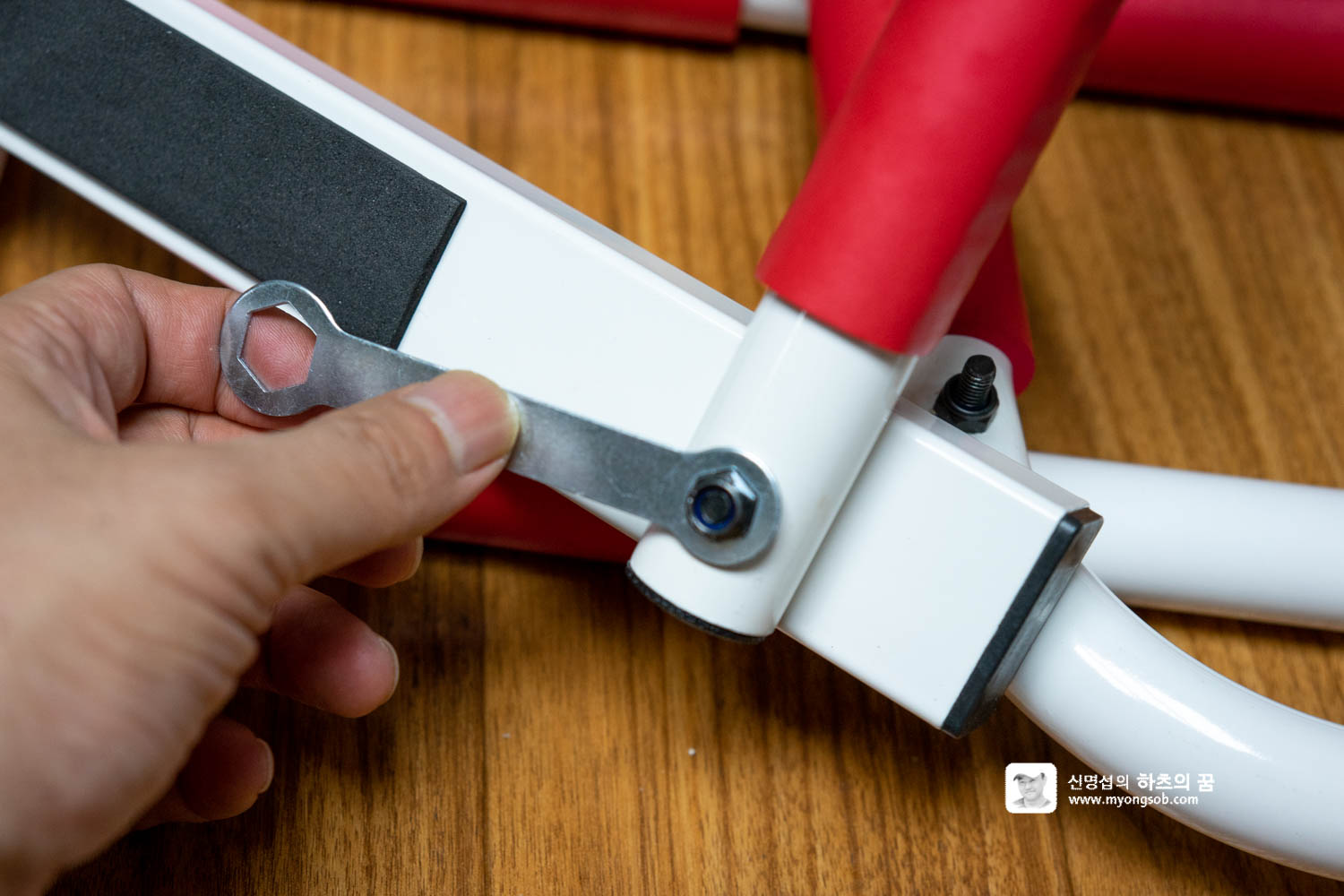 나사를 끼울 때 틈이 잘 안맞을 수 있다. 힘을 줘서 약간 기울이면 나사를 끼울 수 있다. 나사를 조일때는 함께 제공되는 스패너를 사용하면 된다.