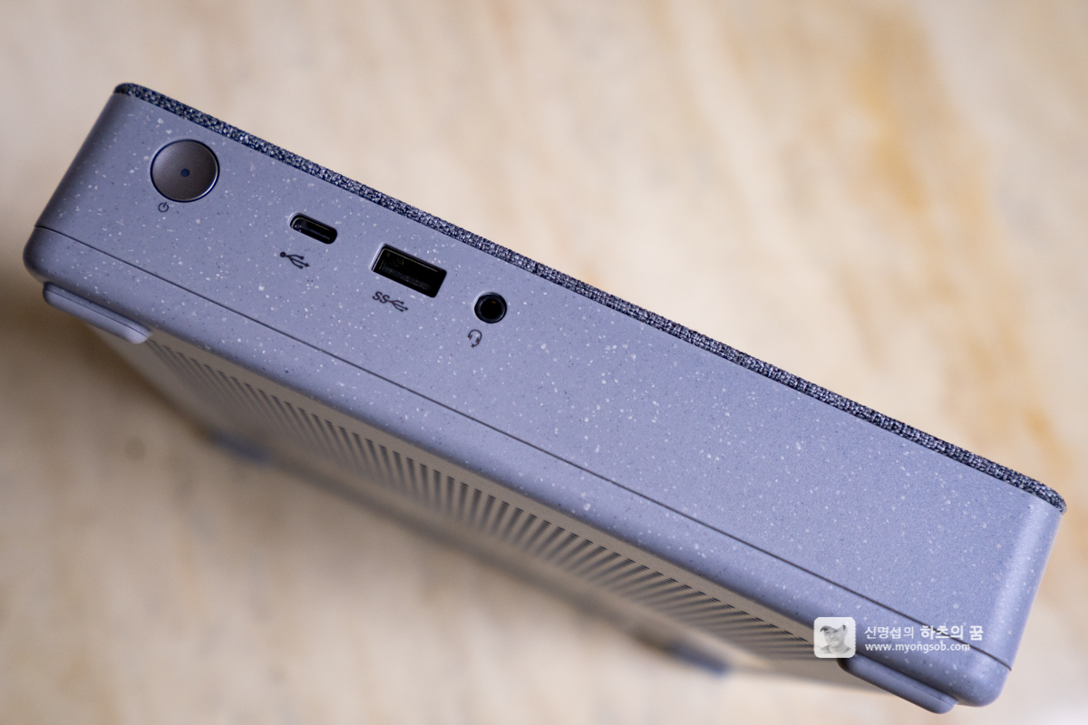 레노버 미니PC 5i 90Q70006KA 전면에는 전원 버튼, USB Type-C, USB Type-A, 이어폰/마이크 단자가 위치해 있다. 자주 이용하는 단자가 앞 부붙에 배치되어 있어서 사용이 편리하다.