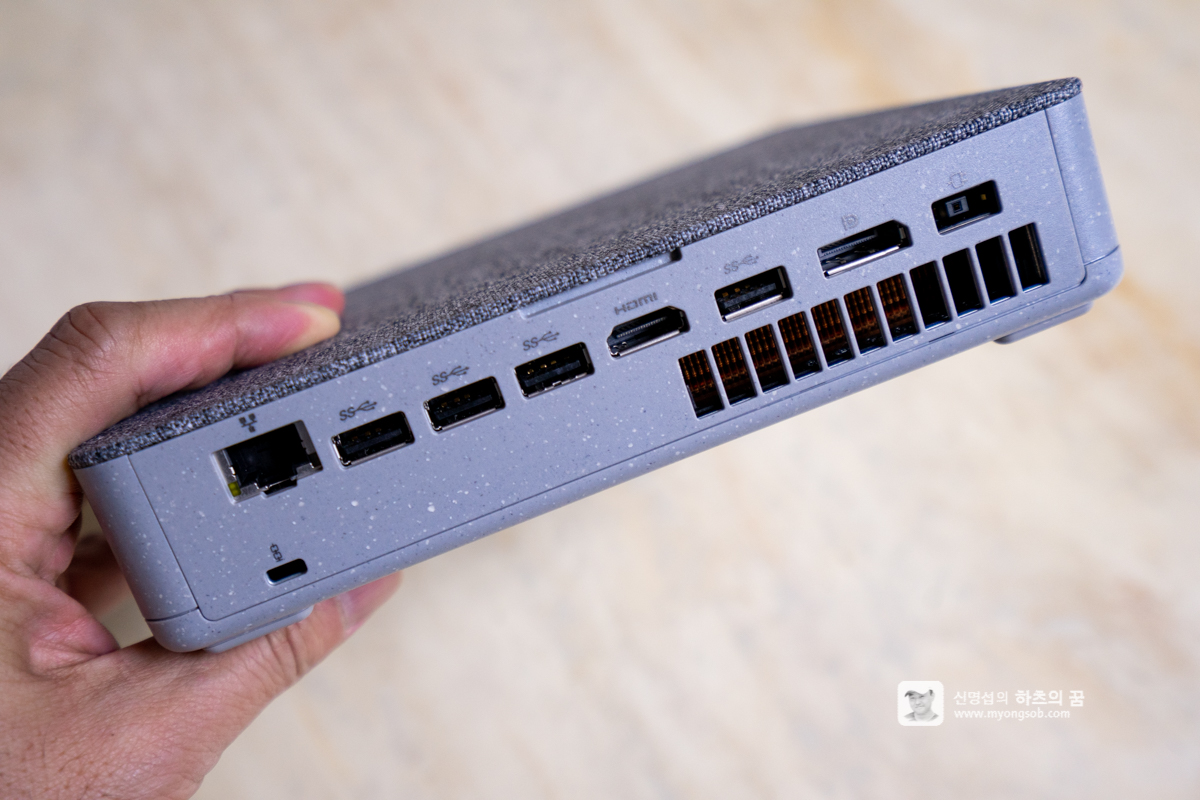 후면에는 RJ-45 유선 네크워크 단자, 켄싱컨 잠금 슬롯, 4개의 USB 3.2 Type-A 단자, HDMI 단자, DisplayPort, 전원포트 등이 배치되어 있다.