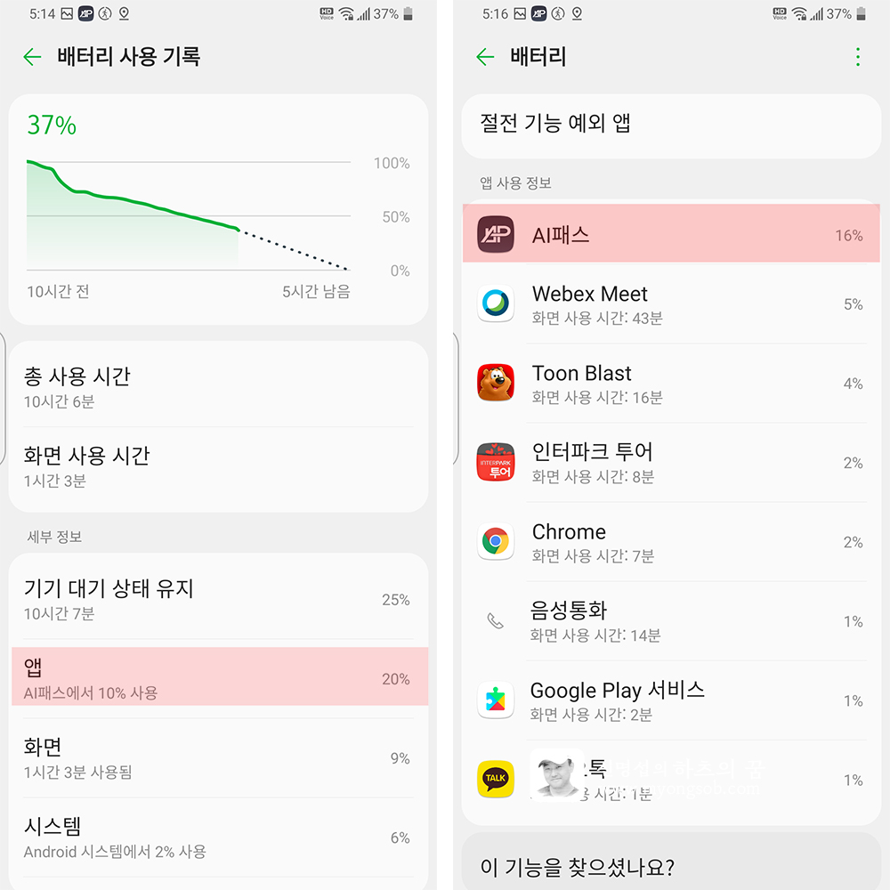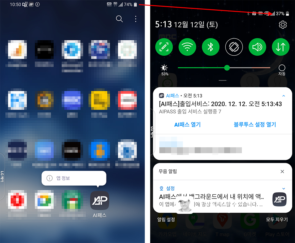 실제로 며칠 정도 앱을 사용하면서 배터리가 급격하게 소모되는 기적을 보았다. 현재 사용하는 폰이 2년 정도되었고, 아직도 완충을 하면 하루 정도는 사용을 해 왔는데, AI패스 앱을 깔고는 하루 두번은 충전을 해야 만 사용이 가능할 정도욨다.