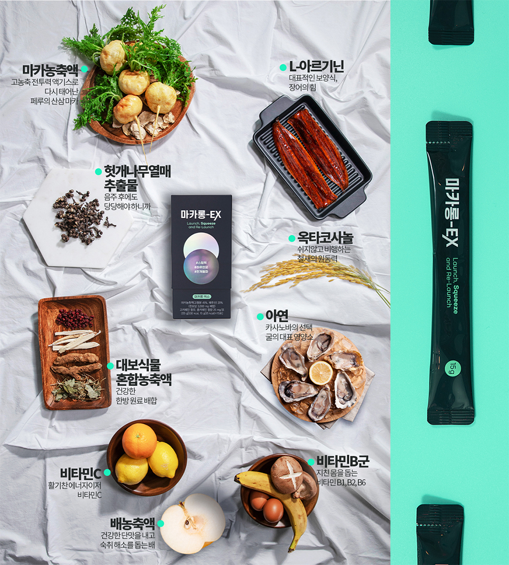각 성분의 추출을 위해 다양한 식품이 사용되었다. 앞서 말한 마카 뿐 만 아니라, 장어에서 L-아르기닌, 헛개나무 열매 추출물, 대보식물(한방원로 배합) 혼합 농축액, 굴에서 얻은 아연, 과일에서 비타민 C 및 비타민 B 등을 추철하여 사용하였다.