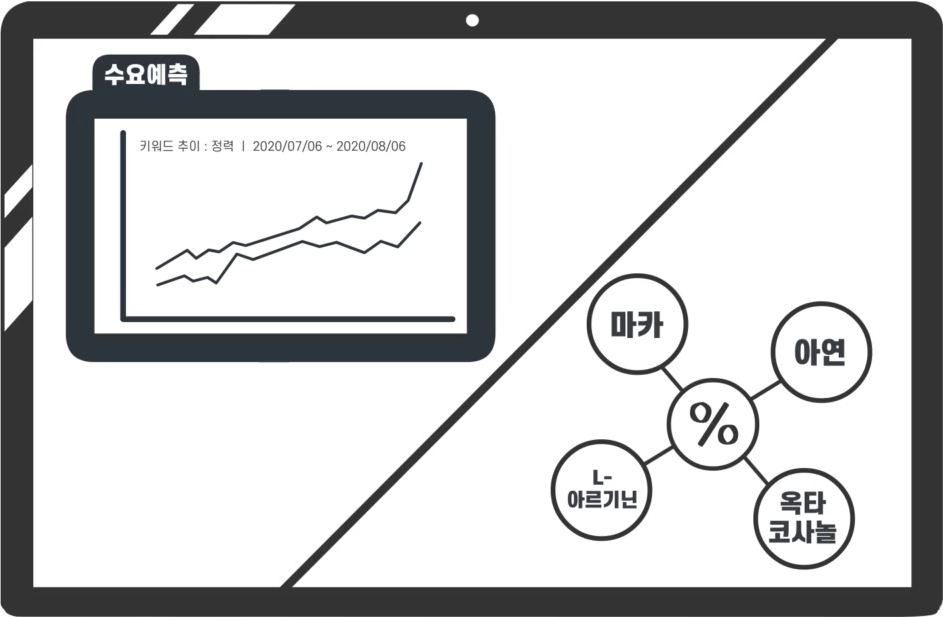 남성 활력에 중요한 필수 아미노산, 무기질, 비타민이 풍부한 원료 '마카'를 함유했고, L-아르기닌, 아연, 헛개추출물, 옥타코사놀 등을 담았고, 체내 흡수율을 높일 수 있도록 공법을 개발하여 적용하였다.
