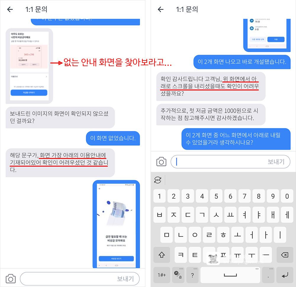 즉, 필자가 가입과정에서 보지 못한 안내 화면을 보여주면서 가입자가 확인을 못했다는 취지로 답변을 하는 것이다.