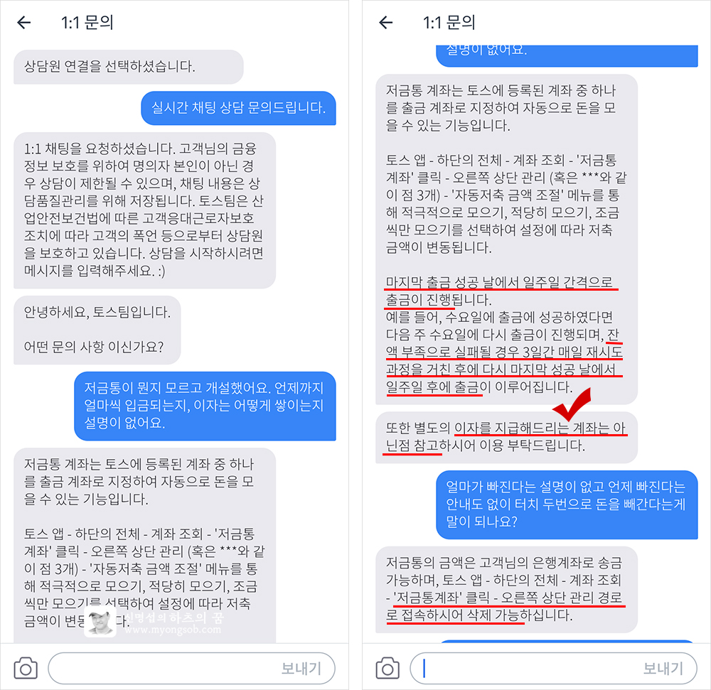 토스 첫 화면 -> 우측 하단 메뉴 터치 -> 우측 상단 고객센터 터치 -> 맨 아래 '1:1문의' 에 들어가면 상담원과 채팅으로 대화를 할 수 있다. 이 메뉴도 너무 깊숙이 있어서 찾기가 쉽지 않다. 숨겨 놓은 듯한 느낌이 든다.