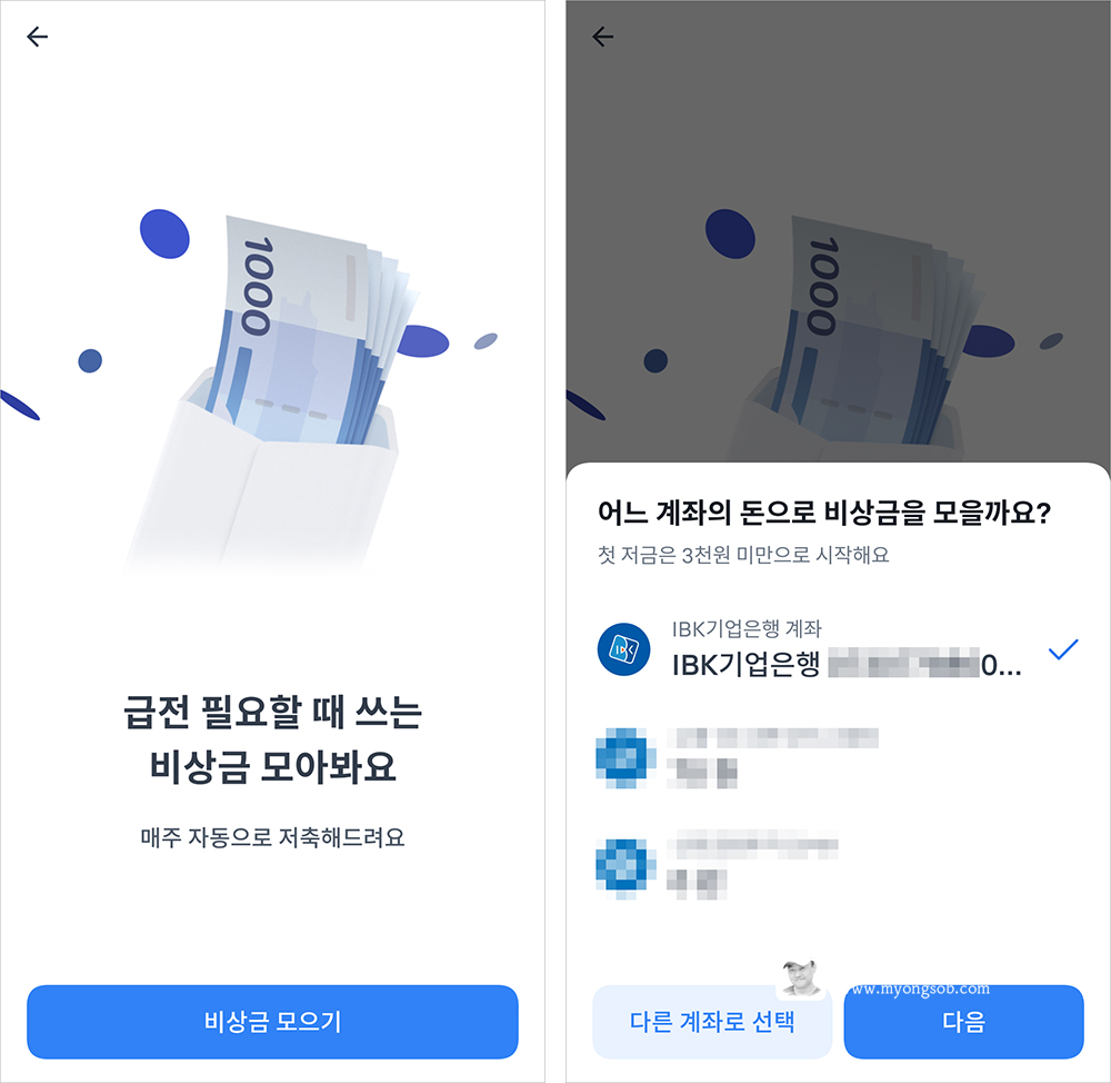 오늘 우연히 '비상금 모으기'라는 상품을 보게 되었고 어떤 상품인지 궁금해서 가입을 진행해 보았다. 어떤 계좌의 돈으로 비상금 모을 것인지 물었고, 이 화면에는 '첫 저금은 3천원 미만으로 시작해요' 라는 안내가 있었다.