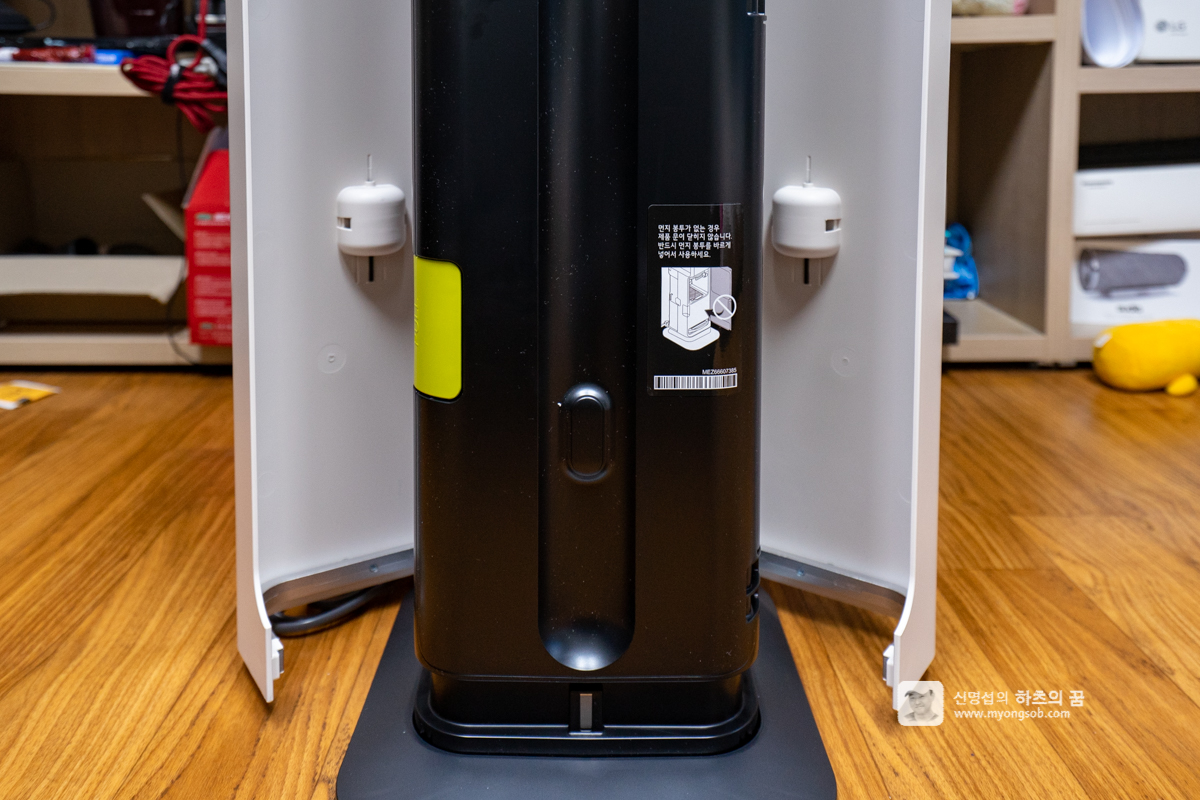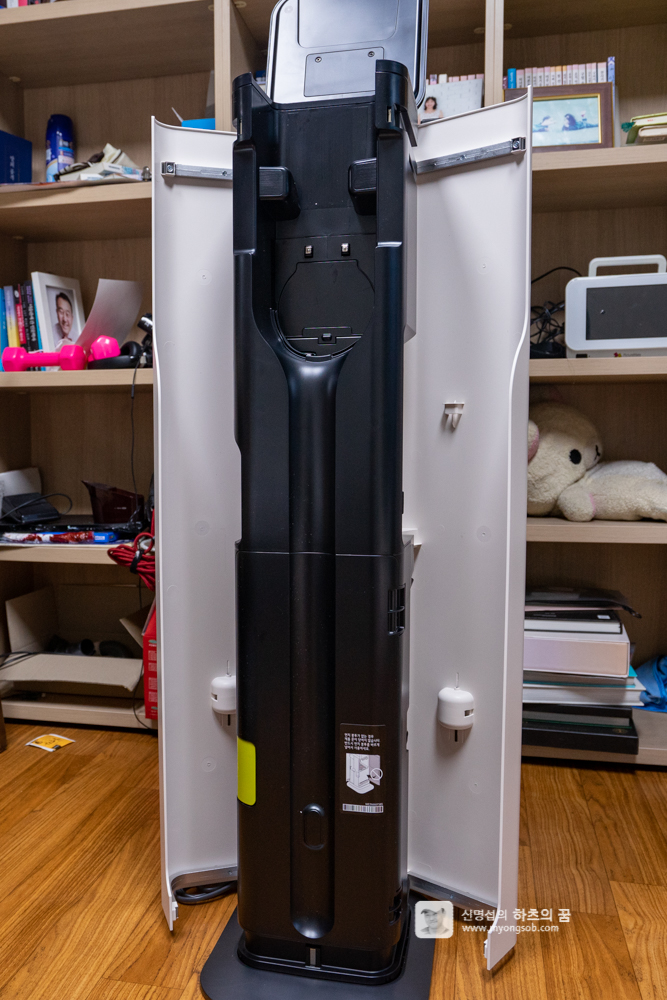 올인원타워의 좌우측면의 커버를 열면 함께 제공도되는 청소 헤드와 툴 등을 보관할 수 있다. 기존 청소기는 이런 부품들을 다른 공간에 보관해야 했는데 아주 깔끔하게 정리할 수 있게 도와준다.