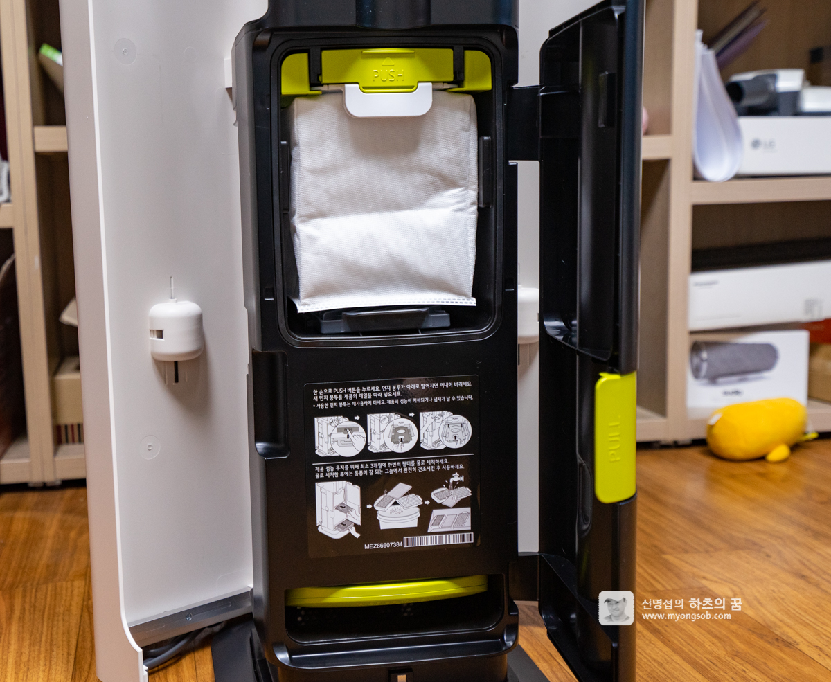 올인원타워의 커버를 열면 먼지봉투와 필터 등을 교체할 수 있는 노란색 오픈 손잡이가 있다. 이걸 열면 위와 같이 먼지봉투와 필터를 꺼낼 수 있다. 먼지봉투는 2.5L의 커다란 크기여서 오랫동안 사용할 수 있고, 1회용이어서 꺼낸 채로 바로 휴지통에 버리면 되기 때문에 먼지청소를 할 때 발생하는 먼지가 전혀 없다.