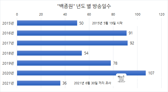 tvN '집밥백선생'을 처음 시작한 2015년 5월 19일 이후 현재(2021년 6월 30일)까지 만 6년 동안 총 507일 동안 방송을 하였고, 연도별로 보면 매년 약 100일 간 출연을 하였다. 거의 쉼 없이 방송을 해 왔다는 것을 알 수 있고, 이 정도로 많이 방송에 출연한 연예인이 또 누가 있을까 하는 생각이 들 정도다.