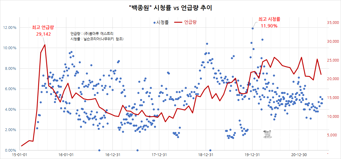 '백종원' 방송 프로그램의 시청률과 언급량 그래프를 함께 비교해 보았다. 어느정도는 두개의 지표가 유사하게 흘러가는 것으로 보인다. 특히 2015년 초반에서 2018년 무렵 까지는 거의 일치하고 있고, 여러개의 방송을 동시에 진행하는 최근에 다시 언급량이 증가하고 있다는 것을 알 수 있다.