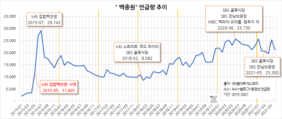 tvN의 집밥백선생이 시작되면서 언급량이 급증한 것을 볼 수 있다. 해당 프로그램의 시청률은 9월에 정점을 찍었지만 관심도는 7월에 29,142건의 언급량을 보이며 최고를 기록했다. 이 기록은 지금까지도 깨지지 않은 최고 수치이다.