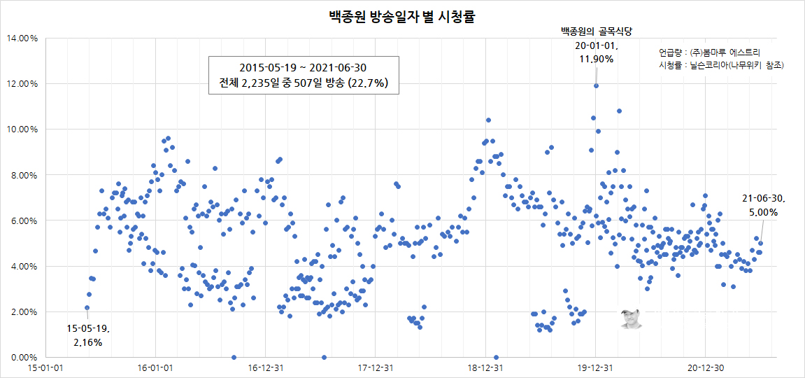 '백종원' 씨가 지금까지 출연한 시청률을 일별로 확인해 보았다. 지금까지 하루에 2개 프로그램이 같은날 방송된 적은 없었다. tvN '집밥백선생'을 처음 시작한 2015년 5월 19일 2.16%의 시청률이 나왔고, 같은해 9월 1일 7.6% 시청율로 해당 프로그램은 정점을 찍었다. 그리고, 가장 높은 시청률을 기록한 날은 2020년 1월 1일로 SBS '백종원의 골목식당'이 11.9%의 시청률을 기록했다.