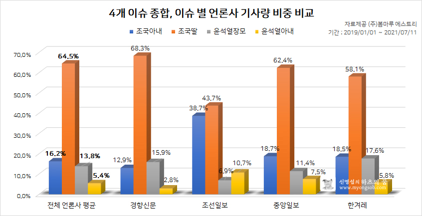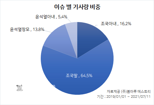 2019년 1월 부터 2021년 7월 11일까지 발행된 기사량을 종합하여 이슈 별 비중을 보면 '조국 딸' 언급 기사가 64.5%로 다른 이슈를 압도한다. '윤석열 장모' 언급 기사는 최근 터져나왔음에도 불구하고 13.8%를 차지하고 있다.