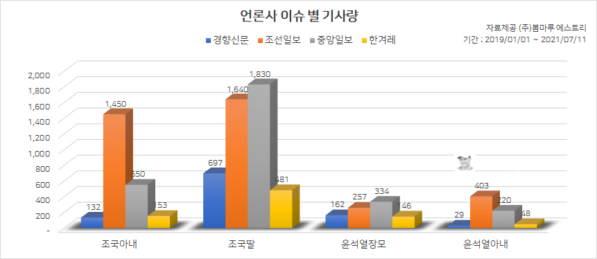 진보와 보수 언론사의 기사량을 살피기 위해, 진보 언론사는 경향신문 · 한겨레, 보수 언론사는 조선일보 · 중앙일보의 기사를 조사했다. 기사량으로 보면 '조국 아내' 언급 기사는 조선일보가 가장 많고, '조국 딸' 언급 기사는 중앙일보가 가장 많다. '윤석열 장모' 기사는 중앙일보가, '윤석열 아내' 기사는 조선일보가 가장 많다.