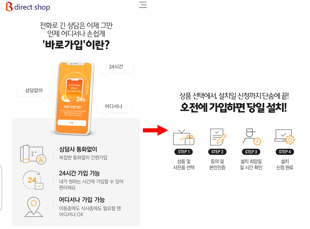 B다이렉트샵의 '바로가입' 서비스는 비대면 인터넷 가입이란 것을 제대로 느낄 수 있게 해준다. 전화상담 없이 인터넷으로 24시간 언제든지 가입할 수 있고, 나에게 맞는 상품과 혜택을 간편하게 선택할 수 있게 해준다.(물론 궁금한 점이 많아 상담이 필요하다면 전화 상담은 당연히 가능하다.)