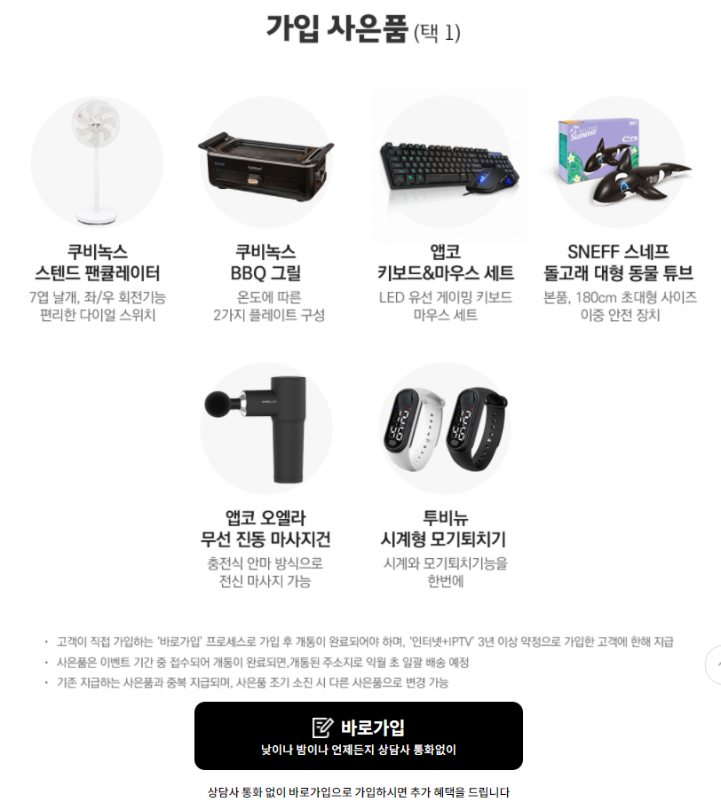 인터넷과 IPTV 결합 + 3년약정으로 '바로가입'을 했다면 위와 같이 추가로 100% 사은품이 지급되는 이벤트에 참여할 수 있다. 추가 사은품이라고 해도 상당히 솔깃한 제품이 많다. 온라인가입 전용 할인과 이런 추가 이벤트까지 공식 사이트이기에 가능한 혜택들이라 할 수 있다.