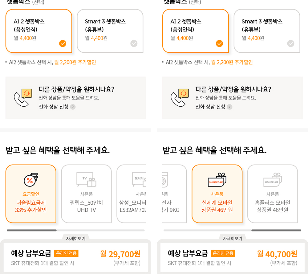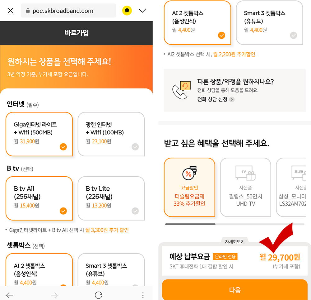 Giga인터넷라이트+Wifi(500MB), B tv 256개 채널(IPTV), AI 음성인식 스피커 포함 AI2 셋톱박스를 상품으로 선택했고, 3년 약정을 하였다. 이미 이동전화가 가족 할인으로 묶여 있어서 그 부분이 제외되어 최종 요금이 33,000원으로 결정이 되었다. 그리고, 사은품 대신 33% 추가할인 받을 수 있는 '더슬림요금제'를 선택했다.