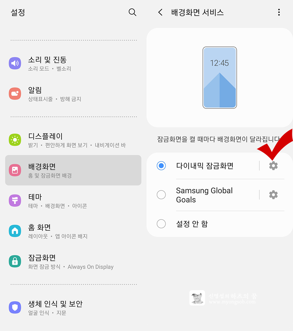 배경화면 이미지 변경은 기존의 스마트폰과 다를 것이 없다. 하지만, 다이내믹 잠금화면 설정은 갤럭시 스마트폰을 사용하지 않은 분들에게는 낯선 기능이다. 해당 기능은 설정하면 잠금화면을 켜질 때마다 다른 이미지를 보여준다.