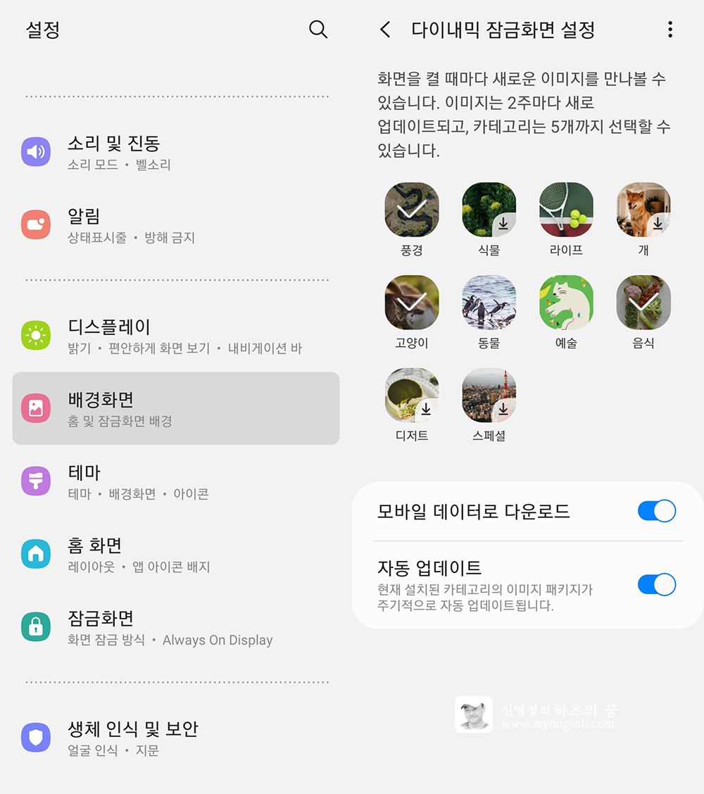 풍경, 식물, 개, 고양이, 동물, 음식 등 다양한 카테고리르 선택할 수 있고, '자동 업데이트'를 설정해 두면 2주에 한번씩 이미지가 새롭게 업데이트된다.