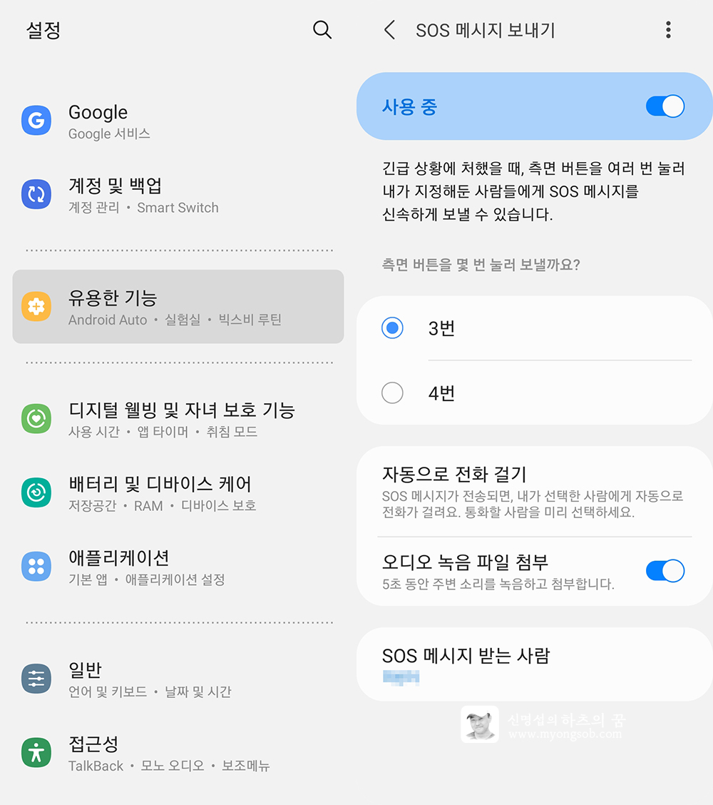 개인적으로 꼭 설정해 두었으면 하는 기능이 'SOS 메시지 보내기' 기능이다. 위급한 상황에서 지정된 전화번호로 빠르게 연락을 하는 기능이기 때문이다.