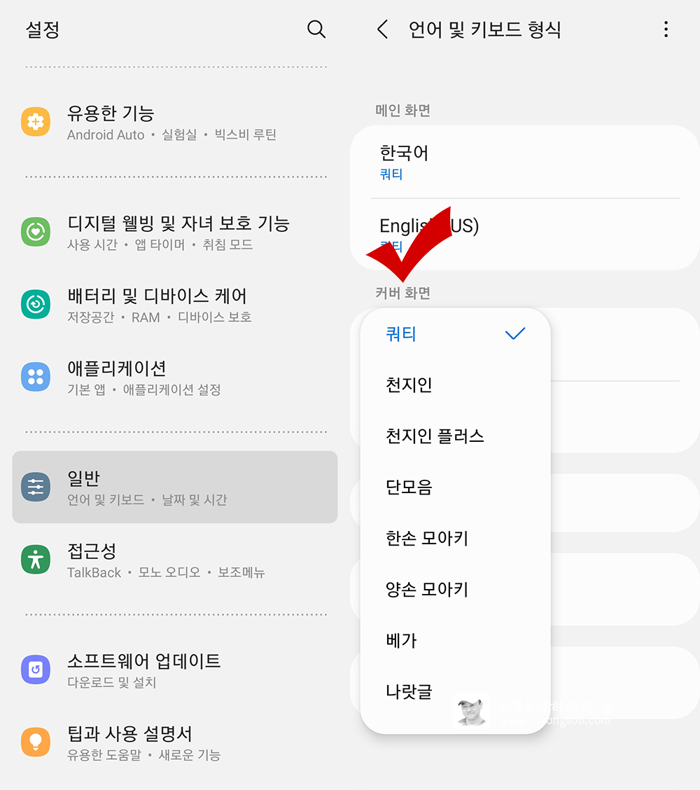 LG 스마트폰 사용자가 갤럭시 폰을 사용할 때 불편한 점 중 하나가 키보드다. LG 스마트폰에서는 쿼티 키보드를 사용했지만 삼성 갤럭시 폰은 천지인 키보드가 기본으로 설정되어 있다.