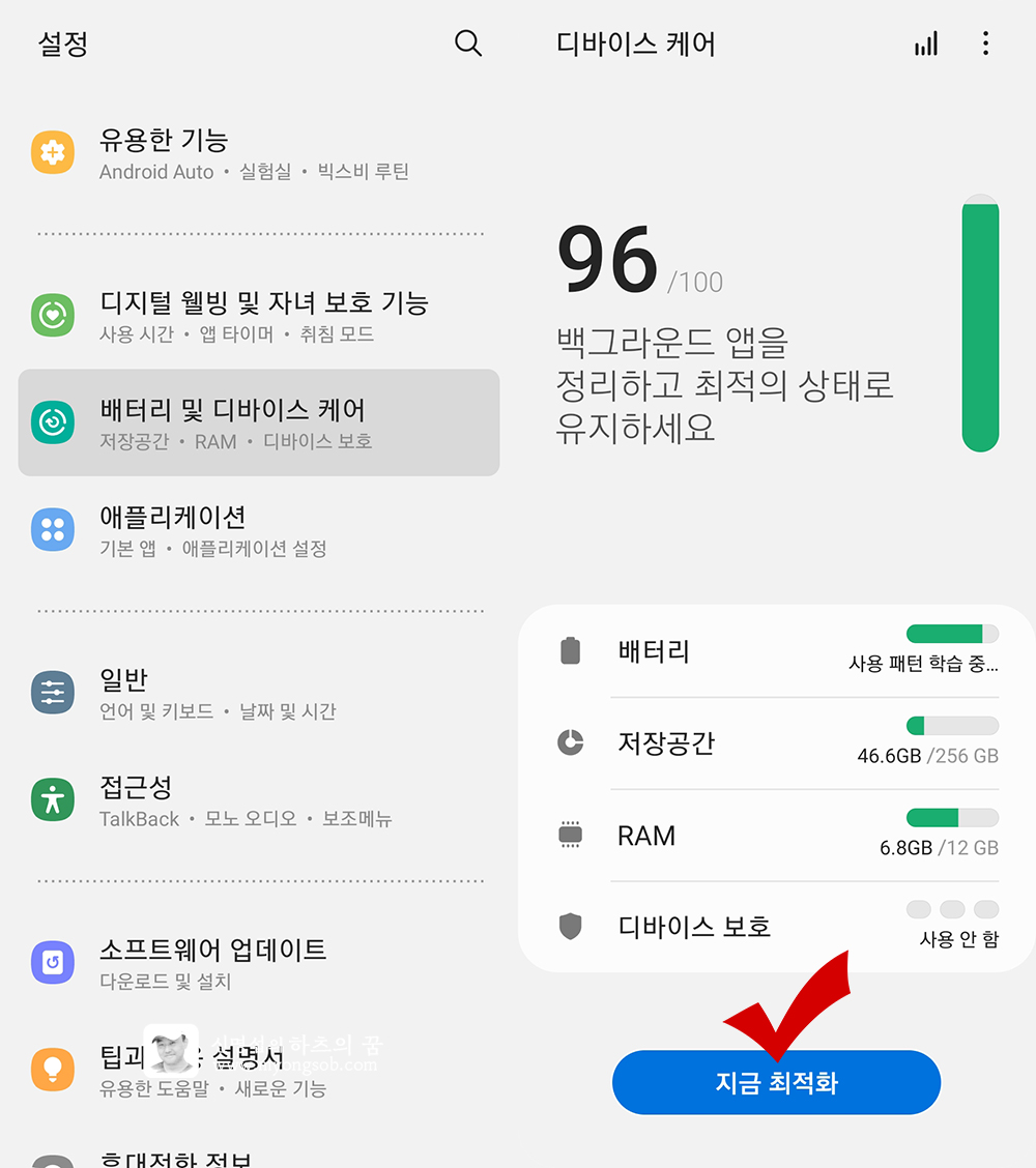 설정의 '배터리 및 디바이스 케어'는 그런 문제를 눈으로 확인하고 관리할 수 있도록 도와준다. 배터리 사용시간, 저장공간 이용율, 메모리 사용량, 디바이스 보호 등의 메뉴가 존재하고 각각 관리를 위한 기능을 제공한다.