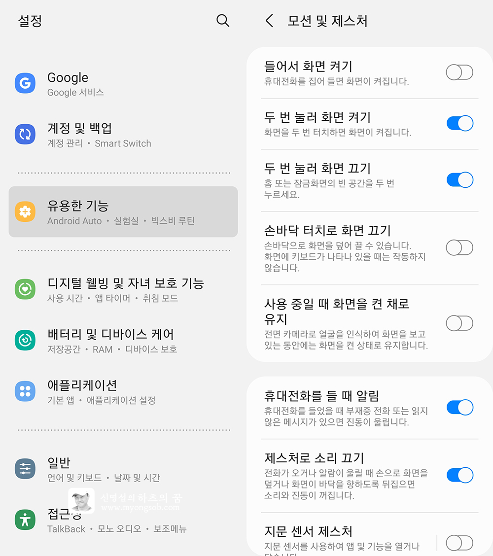 스마트폰의 움직임을 통한 다양한 옵션을 설정할 수 있는 메뉴가 '모션 및 제스처' 다. 손동작을 통한 화면 켜고 끄기, 제스처 감지 및 소리 설정 등 동작에 따른 설정도 한번씩 확인해 보시라.