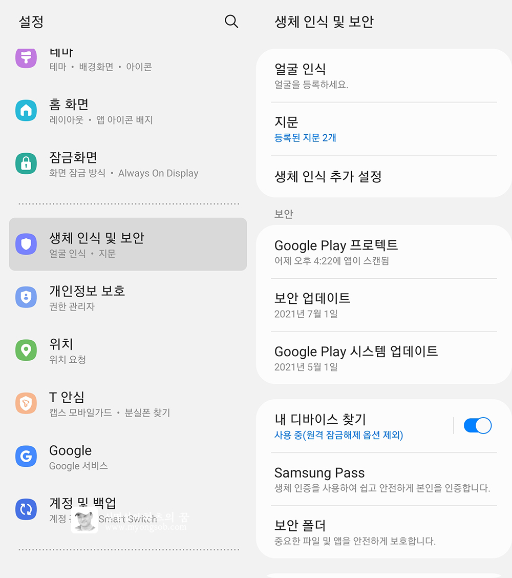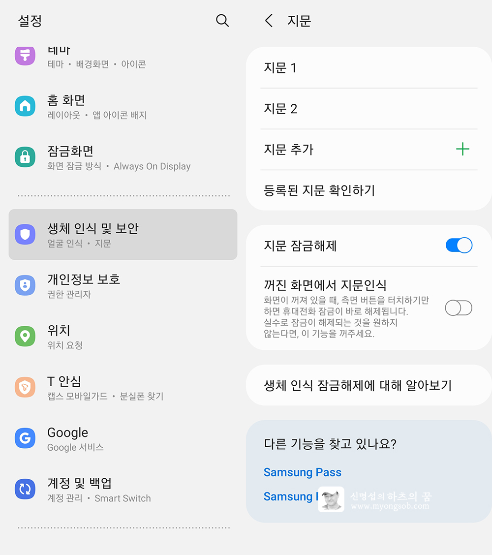처음 폰을 설정할 때 지문 설정이 나타나지만 나중에 설정하려고 지나치는 경우가 많다. 지문설정은 설정->'생체 인식 및 보안'->지문 에서 설정할 수 있다.