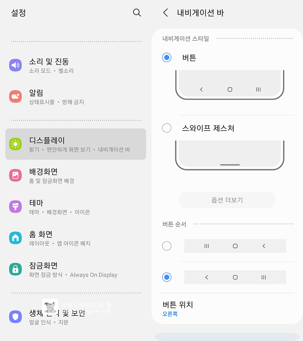 설정->디스플레이->내비게이션바 에 접속하면 위와 같은 설정 화면을 볼 수 있다. 여기서 버튼 순서를 변경할 수 있다.