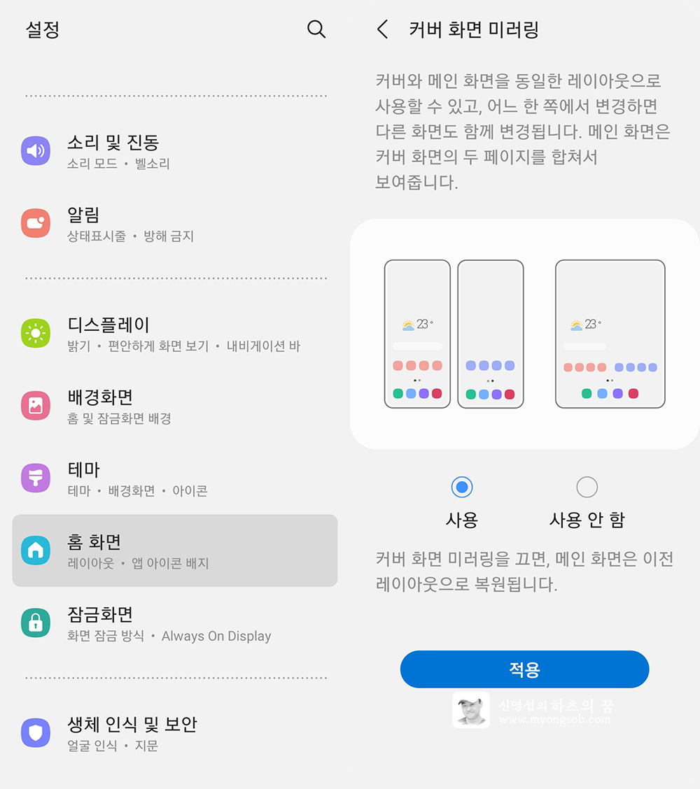 메인화면과 커버화면은 앞서 말한대로 각각 설정에 따라서 다르게 동작한다. 그런데 화면에 배치하는 앱 및 위젯 등은 굳이 다르게 할 필요가 없다. 이런 경우 '홈 화면' 설정의 '커버화면 미러링'을 이용하면 편리하다.