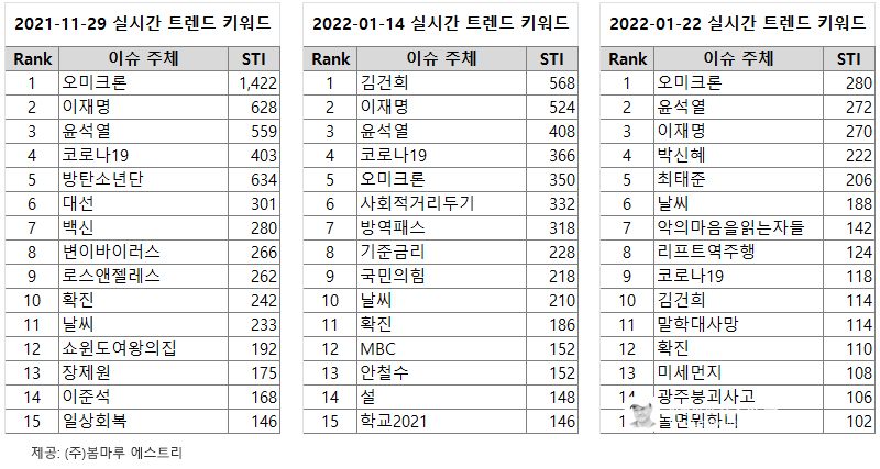 관심도가 폭증했던 2021년 11월 29일 실시간 트렌드 키워드를 보면 오미크론의 STI 1.422로 2위와 큰 차이를 보이며 1위를 차지했다. 그리고, 어제(1/21) STI 280으로 전보다 관심은 떨어졌지만 해당일자 1위를 차지했다.