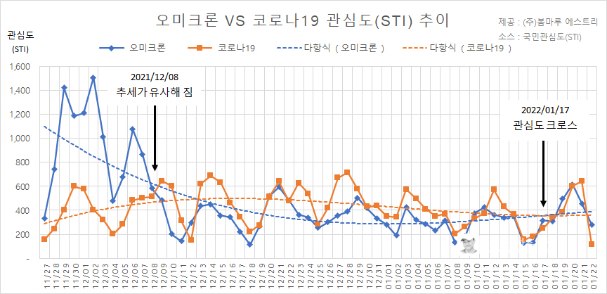 그후 12월 8일부터는 코로나19와 오미크론은 관심도(STI*)가 유사한 관계를 보인다.(상관계수 r=0.67) 오미크론은 코로나19에 비해 확산 속도가 매우 빠르다는 점과 치사율이 낮다는 점이 부각되었고, 코로나19과 함께 관심을 받고 있다.
