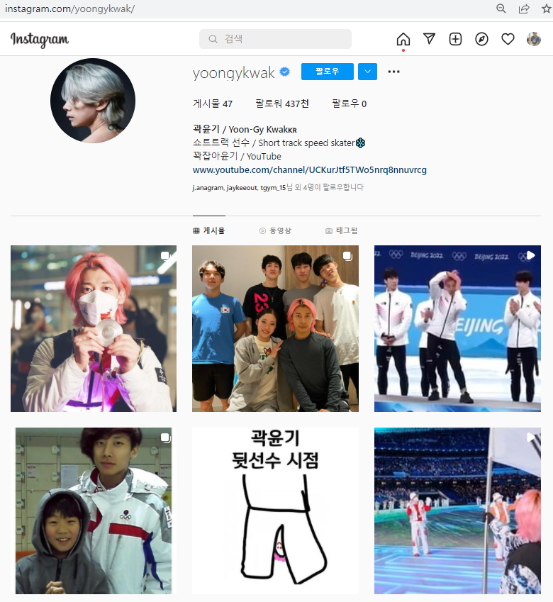 곽윤기 선수는 유튜브 뿐 만 아니라 인스타그램에서도 두각을 나타내는 셀럽으로 성장해 있다.