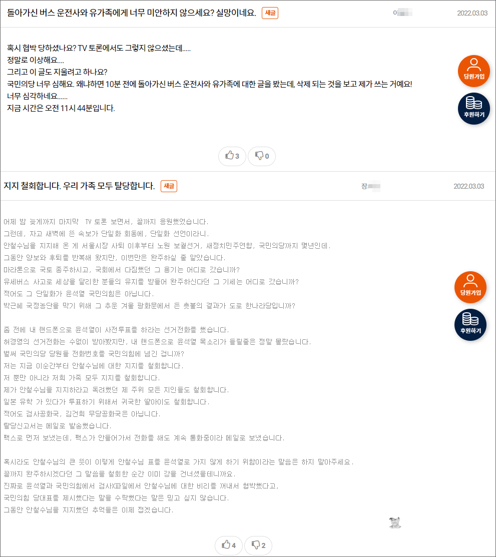 국민의당 자유게시판에는 이번 결정에 실망과 성토하는 불만의 목소리가 가득하다. 그 중 유세 중 돌아가신 분들에 대한 심정, 탈당 방법 등 심각한 목소리도 흔치 않게 보인다.