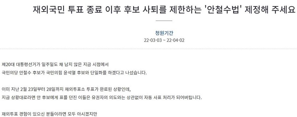 재외국민 들은 투표 완료 후 안철수 사퇴해서 사표가 된 것을 분통해 하고 있다. 그래서, 재외국민 투효 이후 후보 사퇴를 못하게 하는 '안철수법'을 발의해 달라는 국민청원이 올라와 있는 상태다.