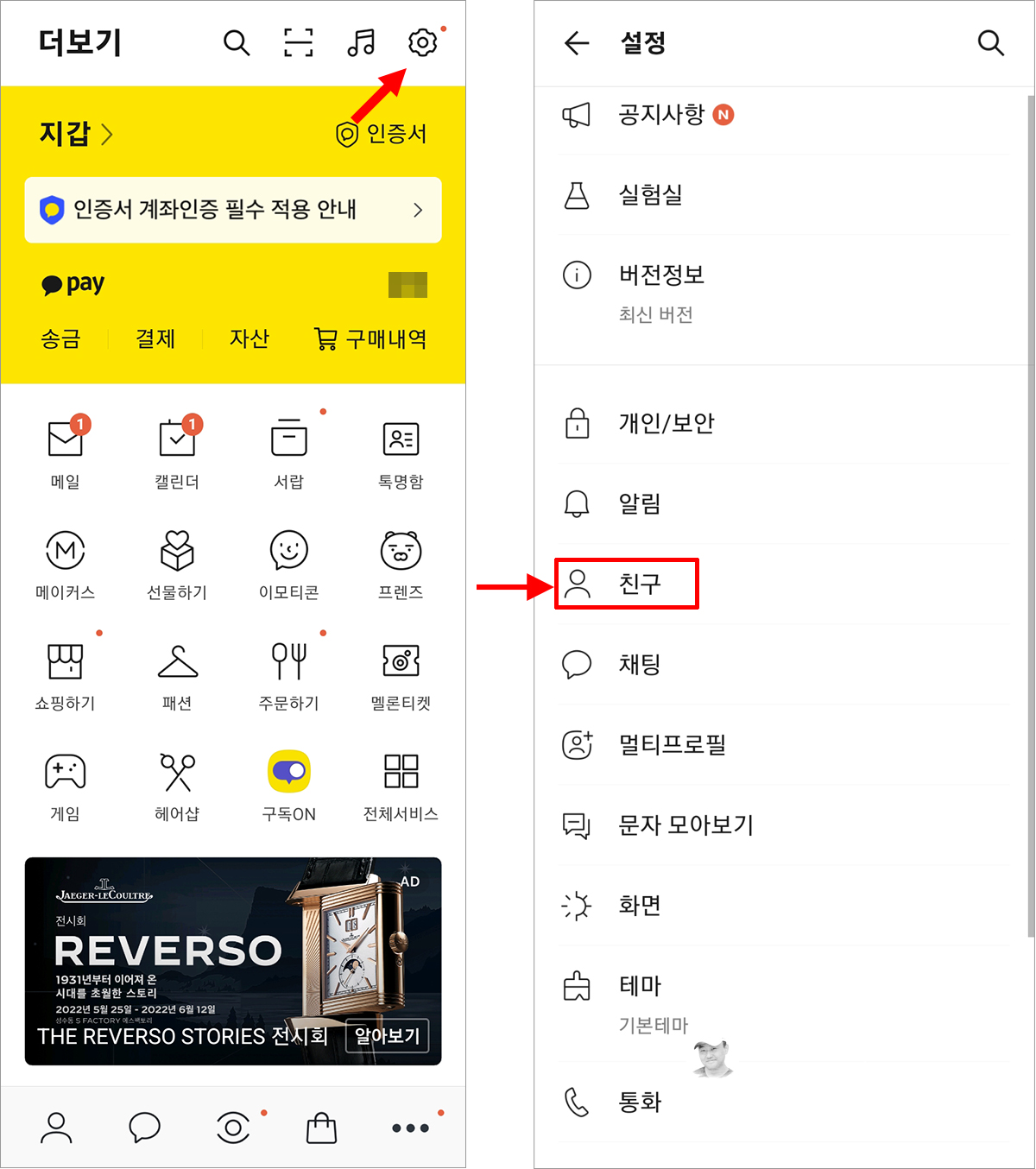 카카오톡 하단의 [...]을 누른 후, 우측 상단의 설정 버튼을 누르면 '캘린더' 메뉴가 보인다.