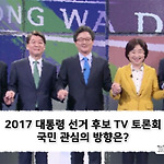 2017 대선 TV 토론, 승자가 있었을까?SBS와 한국기자협회 주최로 4월 13일, '2017 국민의 선택, 대통령 후보 초청 토론회'가 열렸다. 각 당의 대선 후보인 문재인, 안철수, 홍준표, 유승민, 심상정 등이 참석했으며 간혹 실수가 있긴 했지만 이번 TV 토론이 중요한 변수가 될 것이란 생각으로 많이들 준비를 하고 나온 듯 보였다. 대선기간이 짧기 때문에 후보들을 일일이 검증할 시간이 없고, 그들의 정책도 꼼꼼히 따져볼 수 있는 기회가 적기에 TV 토론회에 대한 관심이 높다. 지난 대선 토론회는 전국 시청률 기준 1부 11.6%, 2부 10.8%로 동시간대 최고 시처률을 기록했다. 2017년 19대 대통령선거 분석 목록보기 KBS 대선 TV토론, '문재인펀드'에 묻히다. - 2017 대선 후보 ..